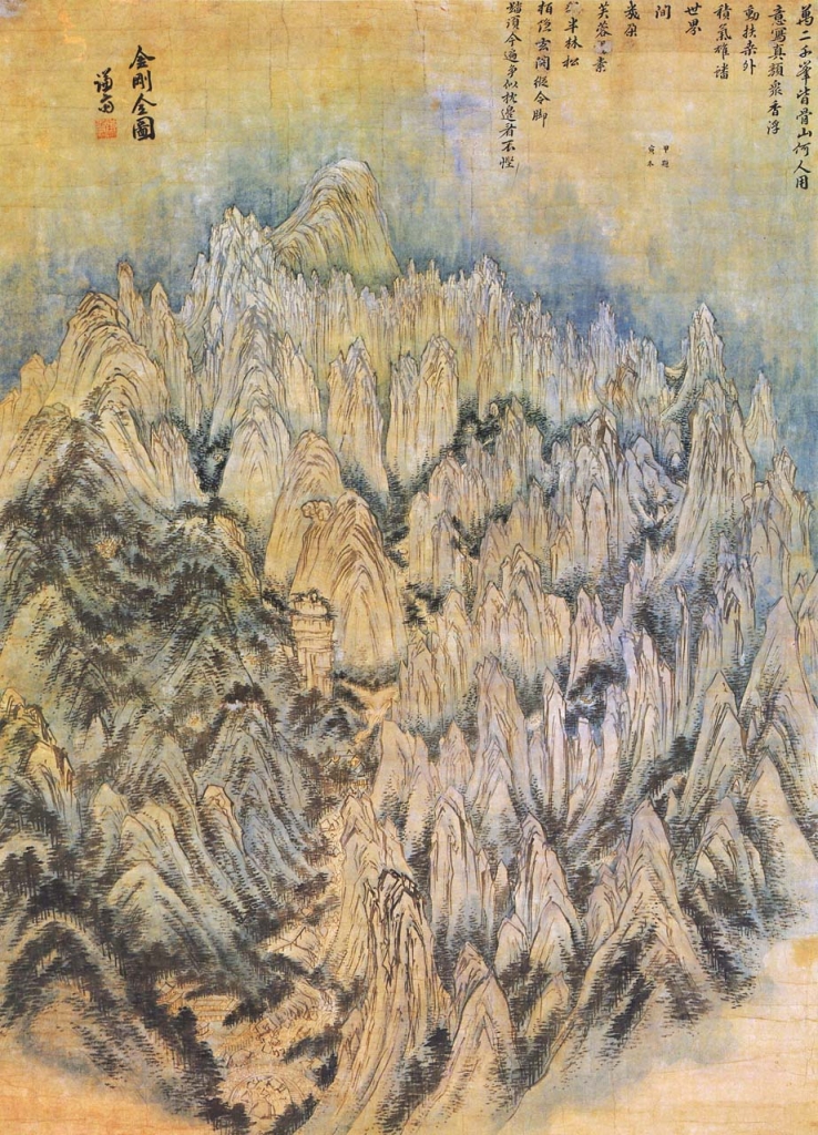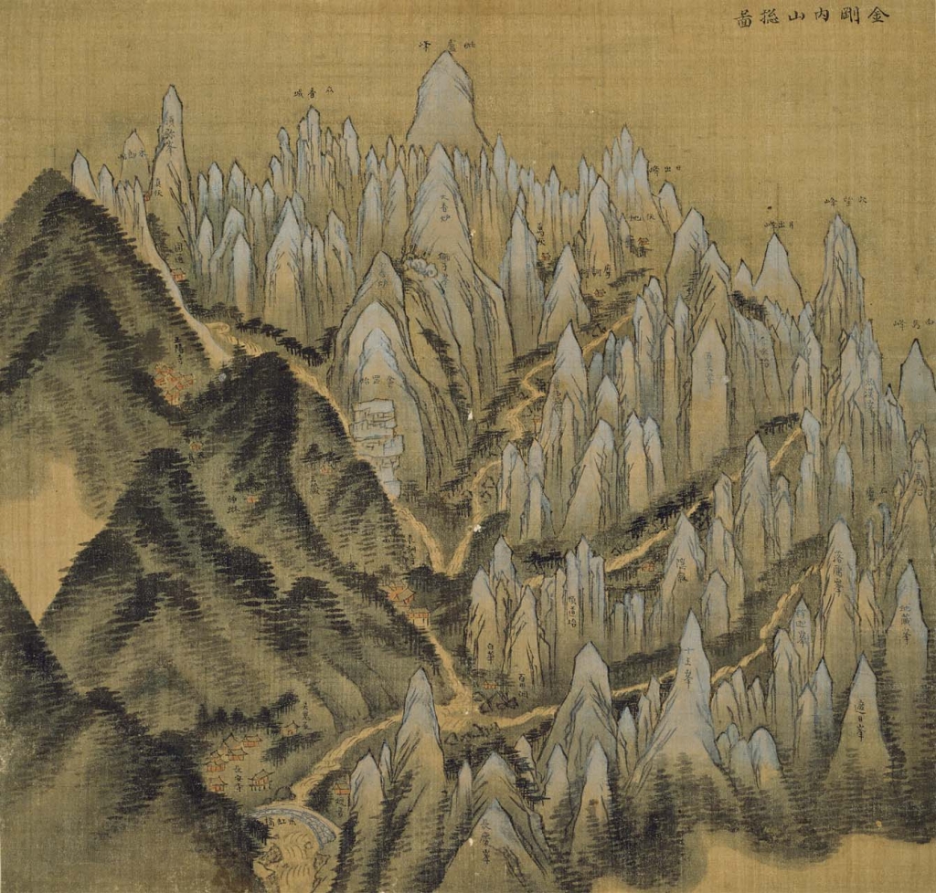 因為鄭敾沒有留下相關的日記或其他形式的著作,難以確切估計他前往金剛山的次數。不過,由鄭敾及其友人的往來紀錄,可以確認他至少前往金剛山兩次。由此推測,一旦鄭敾曾經前往金剛山並繪製草圖,他就可以利用這些草圖再製許多關於金剛山的圖像。現藏於韓國三星現代藝術博物館的〈金剛全圖〉(圖13)為鄭敾1734年所作,此作為掛軸的形式。有別於過往的文人,鄭敾不再繪製中國式的理想山水,而是以描寫實景作為山水畫的題材。他一生中往復數次繪製金剛山,一方面由於他身為職業畫家之故,另一方面也與其金剛山作品廣受歡迎有關。作為職業畫家的鄭敾,為了滿足大量的作品需求,他曾經以一種同時將兩支畫筆握在手中繪製的技法─「兩筆法」來製作作品。因此,可以發現鄭敾現存作品中,有許多內容相似、但在形式與尺幅上有所差異的作品。
