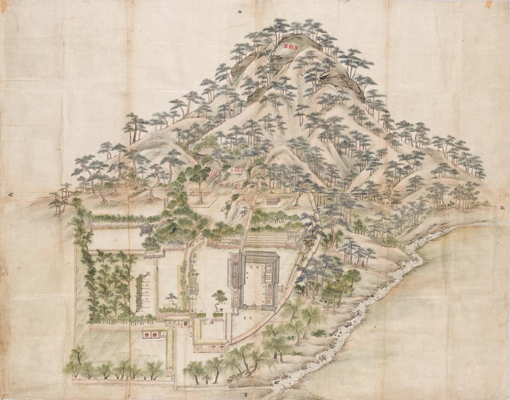 第二群描繪有地產的繪畫,是伴隨著韓國文人開始認同與欣賞他們有別於中國山水畫的韓國當地風光,而出現的內容。這個現象形成了一個新的畫類─「莊園圖」,「莊園圖」是運用一般繪製地產的圖繪技法,再加上真景山水呈現真實山水的效果,共同表現文人的莊園。(註5)這類描繪莊園的繪畫其中一個例子是〈玉壺亭圖〉(圖17),〈玉壺亭圖〉描繪一座依山傍水的私人莊園「玉壺亭」,這個私人莊園的建造是受風水理論所影響,而玉壺亭是以金祖淳(1765-1832)的齋館名「玉壺」所命名。從18世紀末到19世紀初,金祖淳一直是朝鮮政壇中最有影響力的人物。才華洋溢的金祖淳,年僅20歲就被正祖(1776—1800在位)看中進入朝廷,此後金祖淳在仕途上平步青雲,最後在他的岳父純祖(1800-1834在位)即位時升至攝政公,獲得至高無上的權力。在純祖統治時期,金祖淳不僅成為當時最強大的朝臣家族安東金氏的負責人,而且還是整個朝臣集團的領導人。〈玉壺亭圖〉描繪了金祖淳莊園精緻的外觀,包括了建築的真實結構,以及庭院的布局。並以鳥瞰的方式呈現玉壺亭的景致,並標記植物的品類、亭臺與建築的名稱,有助於觀者更一目瞭然這張平面圖所展示的內容。金祖淳於1804年買下這個莊園,但我們可以發現在〈玉壺亭圖〉中的石塊上,描繪有「乙亥(1815)」的銘文。我們大概可以推測這個紀年應該是金祖淳整修竣工,或是他開始於此建造玉壺亭的時間。金祖淳退休之後,他似乎於此度過很長的時間,他與親近的好友於此舉辦雅集,甚至一起策劃政治事項。於今,玉壺亭的所在地已經成為首爾三清洞中的一個住宅區,原始建築群也僅有基石的遺構留存。即使如此,〈玉壺亭圖〉上所描繪的細節以及榜題,仍一再讓我們感受到畫家試圖讓畫面保有某種程度的真實感。在〈玉壺亭圖〉中分為兩個部分構成,分別是居住的建築空間與山景。居住空間的表現以描繪外來、稀有的植物品種與矮樹等小物件,來特別強調住所優雅與華貴的調性;而山景的部分,則明確表現白蓮峰與北岳山。在山景中紅色的榜題是石塊上的銘文,內容題寫著日期、詩文與地理性的名稱,其中一些銘文至今仍然留存。〈玉壺亭圖〉中呈現選擇性的具有個人品味的內容,表現了玉壺亭主人的上流富裕的品味。