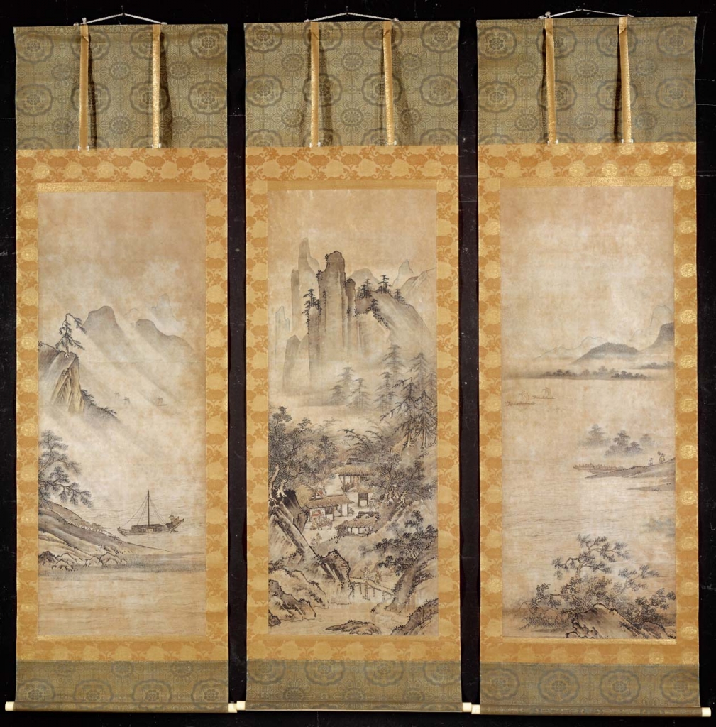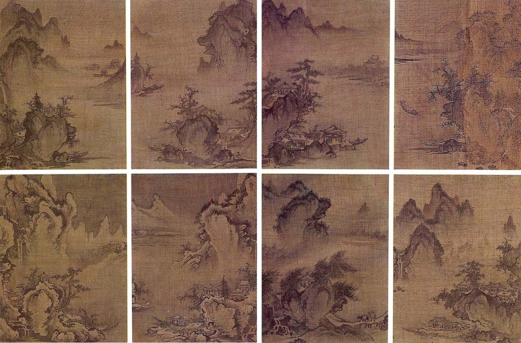 圖3現為一組三連屏的作品,中幅表現的是〈山市晴嵐〉,右幅為〈瀟湘夜雨〉,左幅為〈漁村夕照〉(圖3)。這件三連屏原本應為八件一組的形式,而現在的三連屏形式應是在日本被改裝的結果。如此現象表示,當一個文化在接受新文化的時候,可能會將之轉化、重新創作或者重新詮釋,以符合當地的美學品味或者傳統。這個三連屏的形式展現了中國冊頁的結構在日本的延伸,而這樣的改變也關係到日本室町時代武家的美學價值,或者是為了符合將美術品擺放在壁龕(床の間)的展示傳統。同樣的,朝鮮時期的畫家們也改寫了中國原本瀟湘八景的脈絡,進而發展屬於自己的「八景」,並最終確立了以八景為一組的繪畫傳統,以描繪首爾等地的韓國景色。例如,《壯洞八景帖》(圖4)以八開的冊頁形式描繪壯洞一帶的風光,此地因其為安東金氏與鄭敾(1676-1759)的住所而聞名。