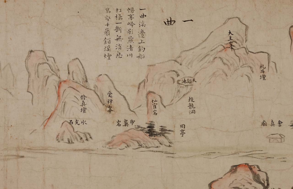 除了上述的形式與風格,「武夷九曲」是16世紀以降另一個重要的流行繪畫題材。位於福建省的武夷山,是南宋朱熹(1130-1200)教授弟子的據點,因此被朝鮮文人推崇為新儒家的發祥地。隨著朝鮮王朝崇尚新儒家思想,以及新儒家學者的不斷壯大,「武夷九曲」這一母題也隨之普及。當朝鮮文人畫家表現此地景的特徵時,也時常在每一景上題寫朱熹的〈武夷棹歌〉,以呼應「武夷九曲」與新儒學的密切關係。此外,許多朝鮮文人也效法朱熹的做法,建立自己的書院,並將之命名為「九曲」。一般認為,與「武夷九曲」相關的作品傳到韓國時,是以手卷的形式傳入,例如李成吉1592年作〈武夷九曲圖〉(圖8),這件作品中有一些後世的收藏家所題寫的題跋,並在每一景上標註該景的名稱。另一個有關「武夷九曲」的例子是由姜世晃(1713-1791)所作〈武夷九曲圖〉(圖9),此長卷長達四公尺,表現武夷九曲景色。姜世晃利用乾筆呈現了實景的效果,並在畫幅中題有〈武夷九曲船歌〉。繪者姜世晃曾於1784年曾造訪北京,參加乾隆皇帝壽典。然而此次造訪,清政府基於安全的理由,使得朝鮮使節到中國時並不被允許前往北京以外的城市。因此,姜世晃雖曾造訪中國,但其所繪的〈武夷九曲圖〉,應是參照固有的圖繪傳統或是依據文學作品描述的內容所製作。