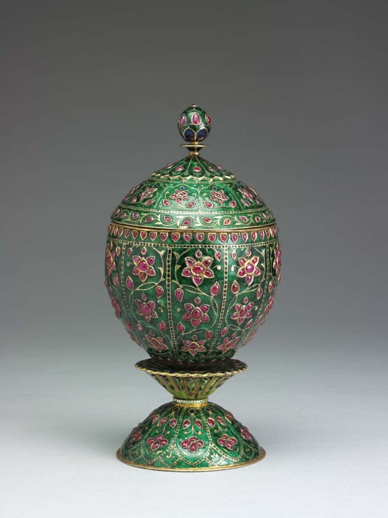 左:圖5 清乾隆〈鎏金銀胎內填琺瑯嵌寶蓋罐〉,印度作品,高16.4公分、徑12公分,國立故宮博物院藏。(圖/國立故宮博物院)