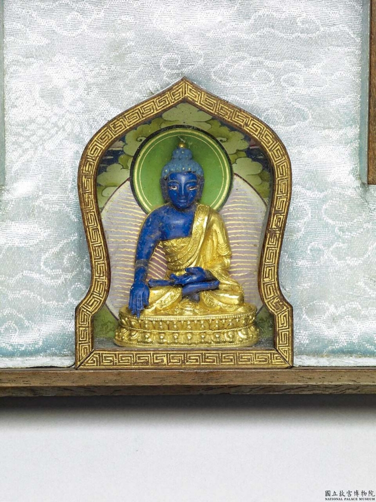 乾隆八年(1743)清宮造辦處著手準備材料,並在乾隆九年至十年(1744-1745)特意尋訪三位尼泊爾工匠進入造辦處,在高宗意志下承作〈五色數珠及五方佛像〉(圖1)和〈五色數珠及五方救度佛母像〉。〈五色數珠、五方佛〉貯於一長方形描彩漆匣,內有五屜格,今僅存四屜,每格有玻璃密封小龕,內供不同材質松綠石、青金石、珊瑚、蜜蠟製成的鑲金造佛像一尊,及同質材的數珠一串。漆箱內缺失的一屜是供奉白色尊像的珍珠製毘盧遮那佛,以及珍珠數珠一串。從清宮留下的簽條得知,缺失的珍珠尊像,是被清朝某位皇帝整屜取走。(註2)箱內數珠沉香氣息撲鼻,據檔案紀載可知皇帝下令「具著灌香」,將香粉灌入念珠孔洞。屜板內上髹藍漆,金書藏文,分別為該尊佛咒語,對治煩惱、成就智慧等內容。由此事可知皇帝對於密典教導不同顏色在經義上對應的功能,深信不疑。