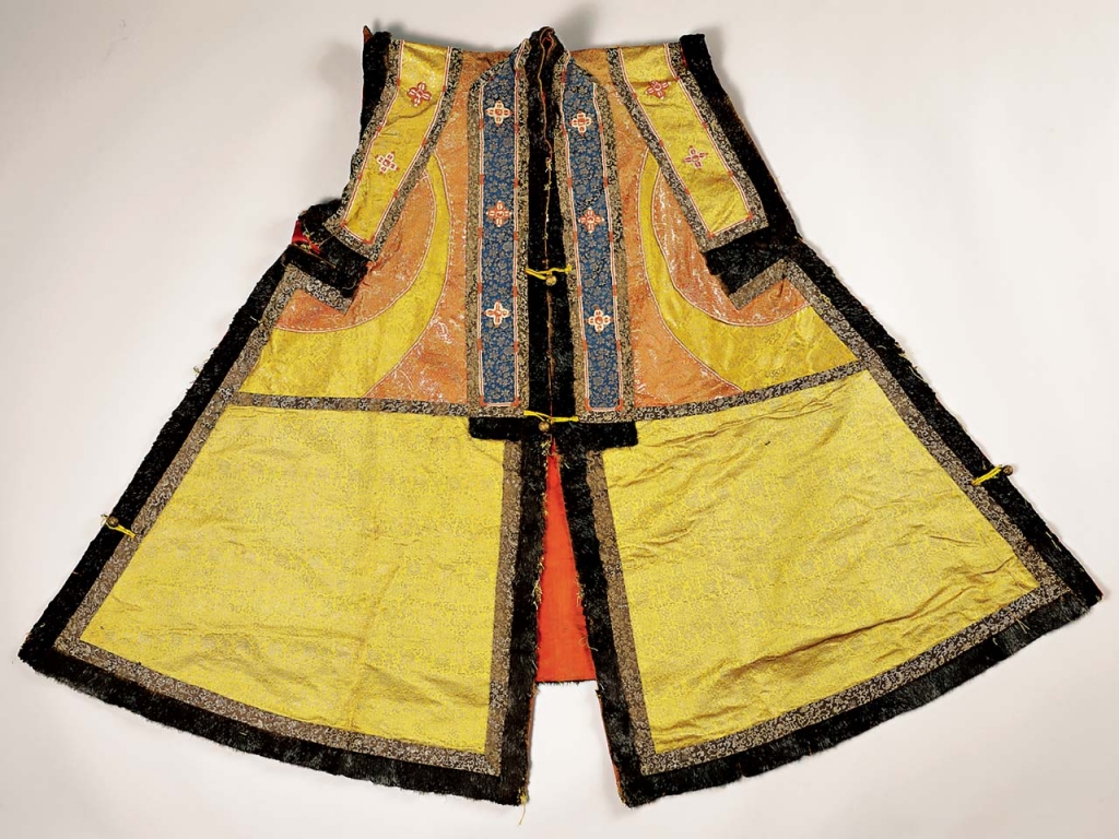 長111公分,肩寬約49公分。以黃綢緞製成,兩側裝飾金花緞,衣緣鑲貂皮,做工精細講究,材質貴重,是活佛或高僧才能使用的樣式。原存雨花閣西配殿三世章嘉的影堂,顯示穿用者崇高的身份地位。