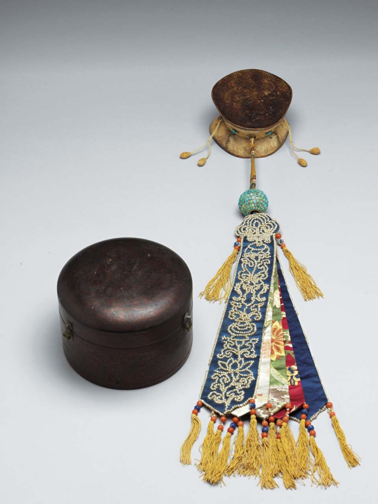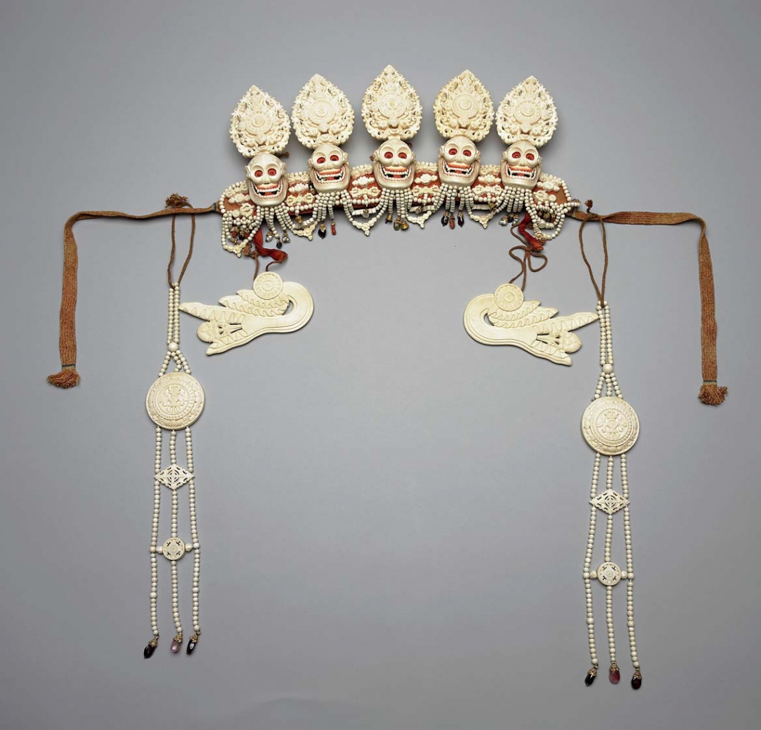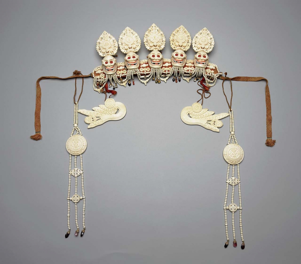 清宮作品,寬45公分,高18公分,垂帶長38公分。跳神時喇嘛所穿戴髑髏五佛冠,由象牙及動物骨骼切割雕琢成,原貯藏於皇帝居住的養心殿。乾隆二十年(1755)清宮引入西藏夏魯寺的老師教習「跳神」舞,服飾由清宮府庫備整,每逢年節法會由喇嘛演舞。