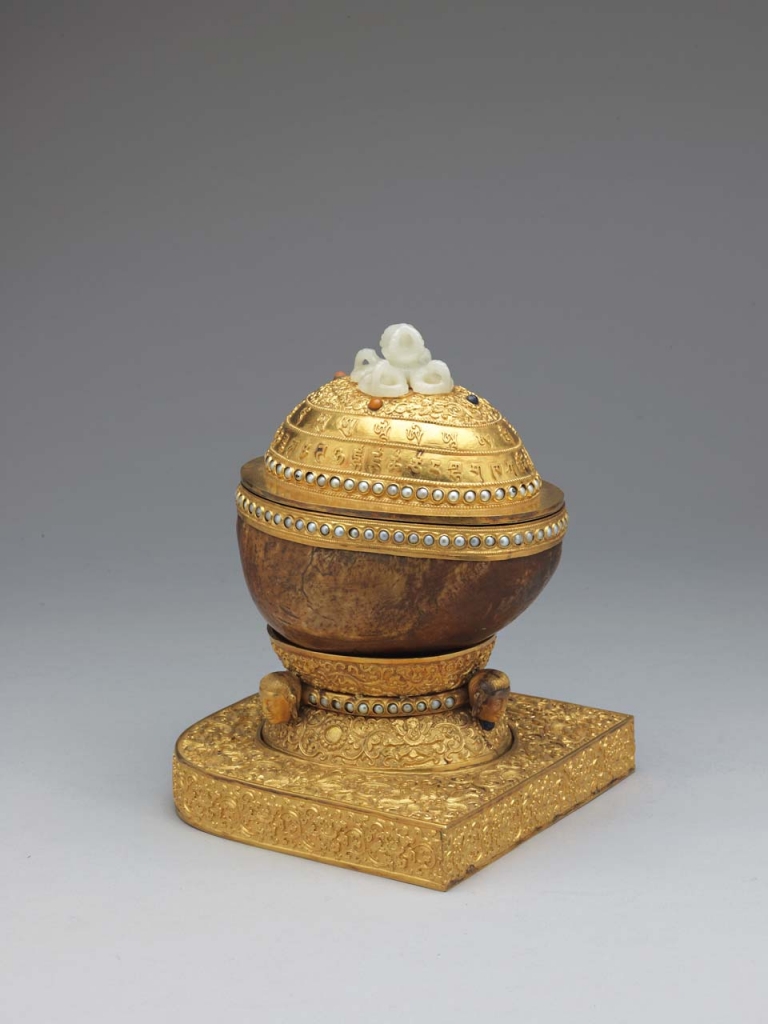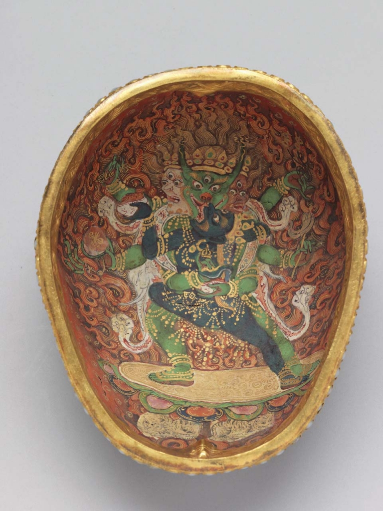 內繪威羅瓦金剛圖,清宮作品,碗高9.3公分,長16.7公分,寬13.5公分。顱骨碗,碗內赤紅地上繪威羅瓦金剛像,綠膚、牛首、三眼、三面,身著金色瓔珞衣,擁抱藍膚佛母。外壁鍍金均敲雕番蓮及梵文,蓋頂為白玉十字杵,此乃無上瑜伽密續舉行灌頂儀式所用法器。