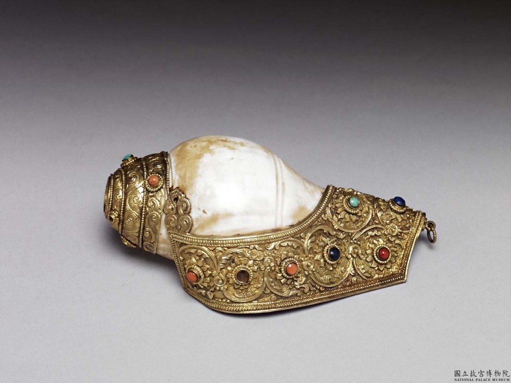 長13公分。白螺在印度被視為聖貝,代表佛陀教化的廣大悠揚、綿長久遠,度化眾生、清淨解脫。藏傳佛教則常用以吹奏法樂之用,或作為盛裝甘露的容器。