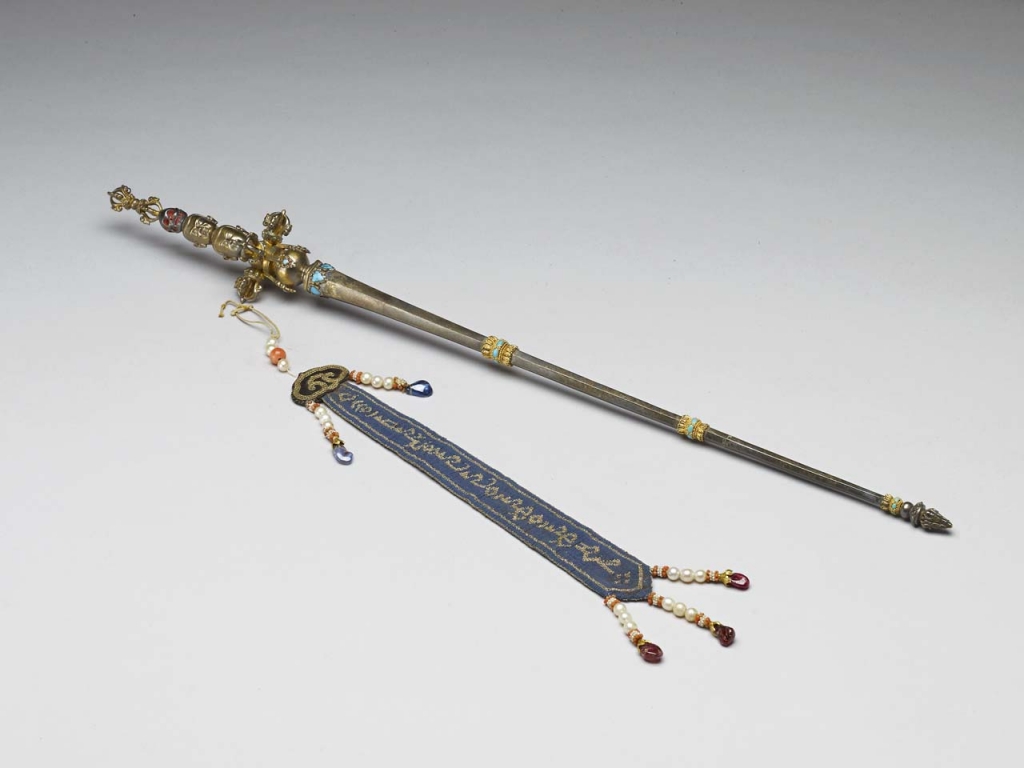 西藏作品,長45.3公分。喀章嘎又名天杖,為女神或空行母的持物之一,象徵大樂和空性的完美結合。本器為銀鍍金,以十字金剛杵和寶瓶連接杖身和杖柄;柄為三個頭顱,代表斷滅貪,瞋,癡三毒;頂端為金剛杵,代表第六大智。