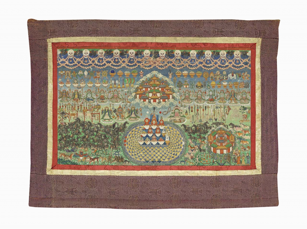 西藏作品,56×74公分。此類繪畫聚集獻予護法的各種供物,常見於寺廟護法殿的壁面。本幅中央須彌山象徵宇宙,四周圍繞七金山與大海,須彌山前供五覺供品等。兩側上方排列15套「護法裝」以及各種寶物、樂器、兵器,畫幅最上方一排為髑體、黑鴉、腸、心編織成的飾幔。