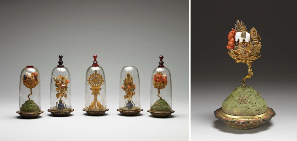 清宮作品,高5.7-19.8公分。帶玻璃罩吉祥供具,頂附暗紅玻璃鈕。本件以銅胎黃地畫琺瑯蓮瓣式碟為基座,托承須彌山與祥雲,祥雲上有雕珊瑚人物、白象及法輪,其他幾件底座有藍料「雍正年製」楷書款,原藏於皇太后的宮室慈寧宮。