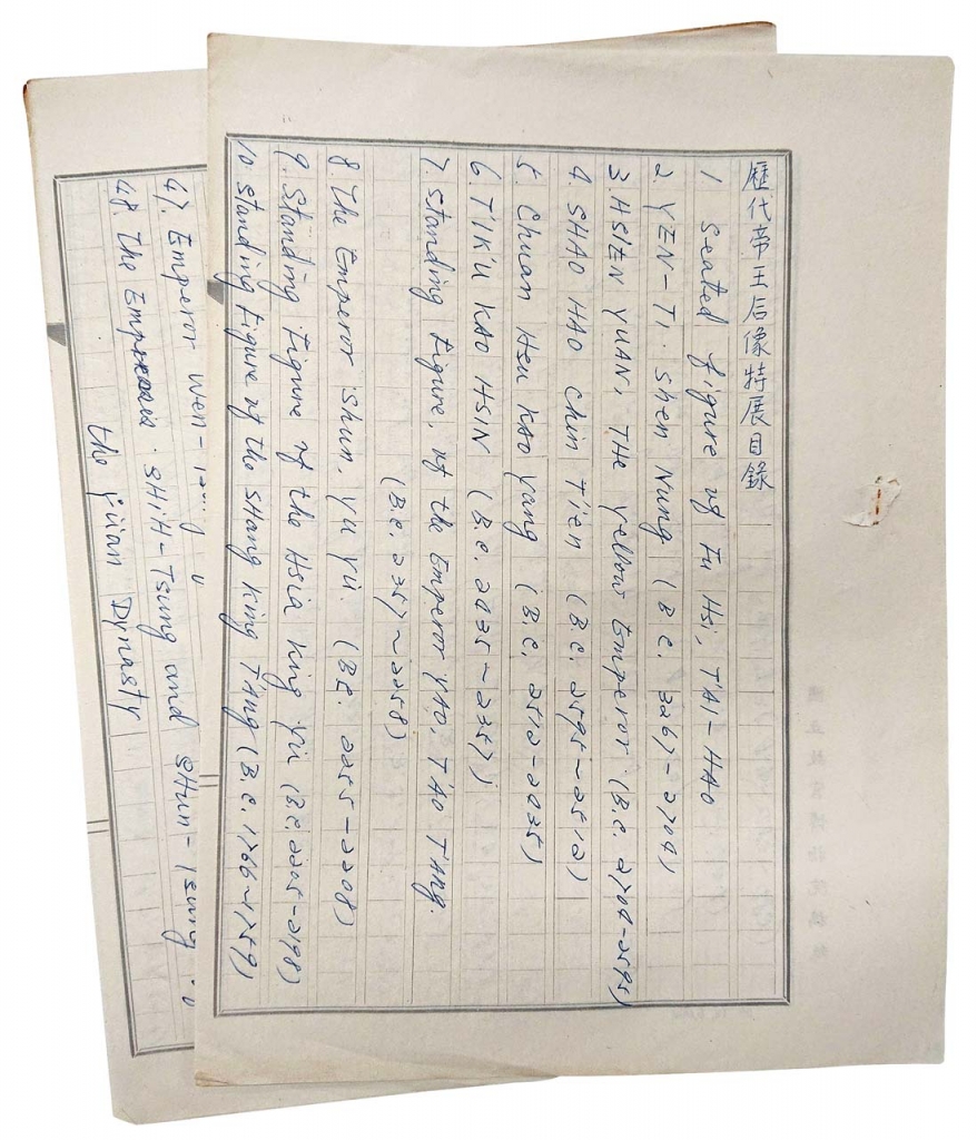 來臺後以帝后像為題舉辦的展覽,除了本次「權力的形狀」特展,目前有紀錄者為民國59年9至12月,為慶祝中華文化復興節而籌辦的「歷代帝后畫像特展」。書畫處至今還收存著當時寫在稿紙上手寫的中英文版展件清單(圖3)。從〈太昊伏羲氏〉開始,挑選夏、商、周、漢、晉、南朝、隋、唐、五代、宋、元、明代帝后像,以〈明熹宗坐像〉作終,共列出63件畫作,可以清楚看出當時意圖從來臺的418幅肖像選列出歷代帝王傳承。