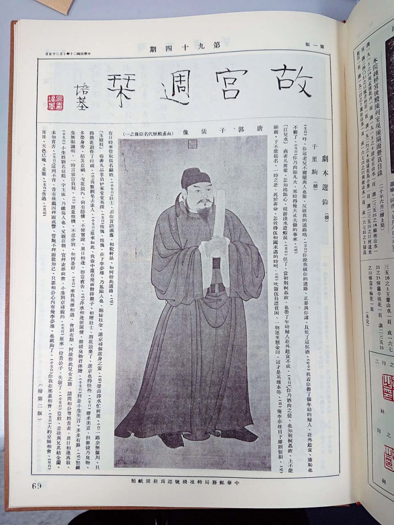 從「尺寸」來看,〈唐太宗立像〉(圖6)幾乎達到三公尺,昂然峙立,將帝王「高人一等」藉由身高具象化了。類似尺幅的帝王像,本院還典藏了〈後唐莊宗立像〉(圖7)與〈唐高祖立像〉(圖8)兩幅。三件畫幅高度均超過270公分,雖然裝束有別,但體態相仿,黑靴款式相同,衣袍尾端飄曳與衣折表現雷同,可知為同時製作的古代帝王群像。現在僅存這三位帝王像,然推測原本數量可能頗多。此外,民國20年時《故宮週刊》多期刊載「南薰殿歷代名臣像」,目前可能均存於北京故宮。這組歷代功臣圖像,很可能與上述這組只存三件的帝王像成套。如《故宮週刊》第94期刊出的〈唐郭子儀像〉(圖9),身形與衣紋的處理,與這次展出的〈唐太宗立像〉亦如出一轍。〈唐太宗立像〉龍袍上的龍頭,為鼻頭、鼻翼明顯的明式龍紋,因此應為明代紀念歷代帝王所做的「群像」之一。旁邊展出的南宋馬麟〈夏禹王立像〉,亦為帝王「群像」之一,不過時代早到南宋理宗朝,原為13幅對應宋理宗〈道統十三贊〉的成組立軸,目前僅剩5幅(圖10),本次選展代表中國帝王始祖的〈夏禹王立像〉做為代表。