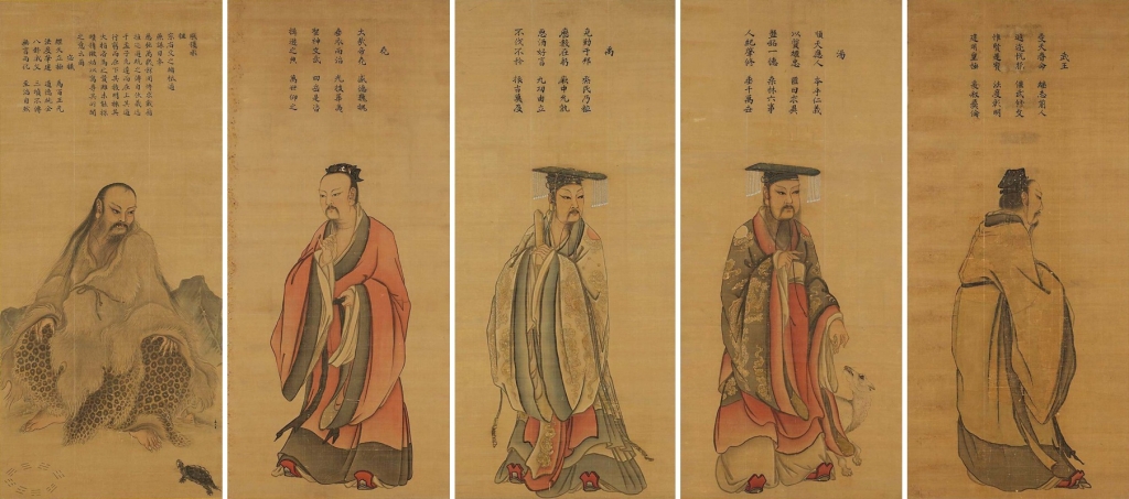 大立軸櫃裡陳列的四張立軸,希望能提供從夏朝到明朝歷代帝王形象的多元樣貌。從「姿態」來看,左邊兩件大禹與唐太宗為立像,右邊兩件宋英宗與明孝宗則是坐像,但或站或坐,皆不失端正,即使是執圭回首、較具姿態的大禹,依然修長雅重。