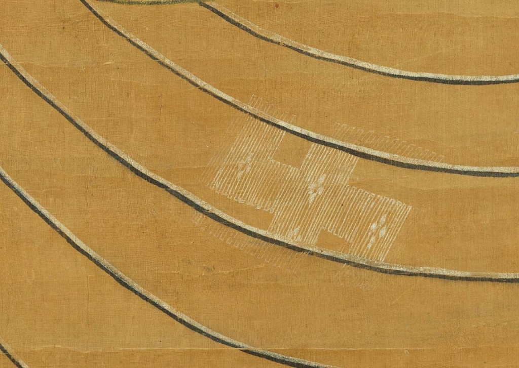 〈宋宣祖坐像〉可能是入宋以後,宮廷畫家依據遺像,添加當時帝王冕服、龍椅完成的想像畫。〈宋宣祖后坐像〉(圖15)則可能是宋初時根據她實際面容、服飾與用具完成的作品,可以一窺北宋初期宮中婦女的衣飾時尚。畫中最令人印象深刻的是對裙子的描寫。宋宣祖后乍看穿了一條棕色的長裙,裙擺甚至長出畫幅之外。但是細看會發現棕色裙子長度僅至白色大袖下方,其後綿延的長線條,其實是半透明的白紗,紗面上還織出卍字紋等圖樣。白紗很容易被認為是透明罩衫,但宋宣祖后身上的是透明罩裙,因此在棕色裙子上,細看也可以發現卍字紋(圖16)等紗面上的圖樣。畫家為了表現裙子上還有一層薄紗,除了描繪上述紗面圖案,還分別畫出這兩層布料各自的褶痕。宋宣祖后下半身看起來有些交錯的線條,分辨後其實是畫家用心經營層次的樣貌。宋宣祖后華麗的鳳紋霞披、頭飾不算低調,但裙子部分仍可呼應對宋代帝后形象「低調奢華」的理解。