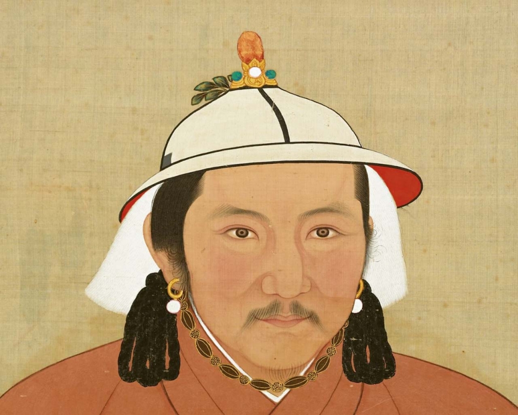 元代帝后雖然僅存半身像,但蒙古族的衣冠服飾清楚可辨,「獨具一格」。例如元世祖忽必烈(1215-1294)、元文宗(見圖17)耳後垂下的三環髮辮、頭上所戴的暖帽與鈸笠冠,以及四幅后像頭頂的罟罟冠,以及身上多樣顏色的織金錦袍,都令人印象深刻。這次展出的四幅元代后半身像,由於身分不明確,過去鮮少展出,然無損其品質。挑選這六幅元代帝后展件的其中一個考慮,是希望盡量呈現其衣飾的多樣性,因此年紀有長有少,帽子的形式與裝飾有別,衣服的顏色也各自不同。雖然只有一個陳列櫃,仍希望呈現蒙元皇室物質生活的奢華富足。