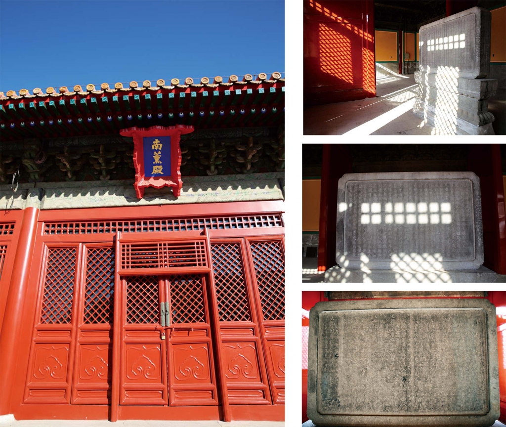 近日修復一新的南薰殿,殿中遷入原本置於殿前的乾隆十四年(1749)〈臥碑〉(圖2)。此碑一面刻乾隆十四年長至日〈南薰殿尊藏圖像記〉,一面刻乾隆四十七年(1782)孟冬月〈書明列代玉冊事〉,碑側一面刻乾隆十四年的題詩,另一側則為清仁宗嘉慶六年(1801)閱覽南薰殿所藏帝王圖像後的題詩。這些詩文也收錄於《御製詩文集》或是《國朝宮史》中,成為瞭解這批圖像收藏始末的重要資料。
