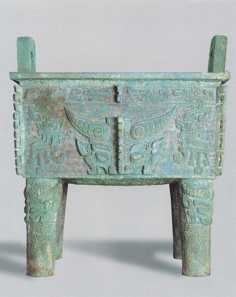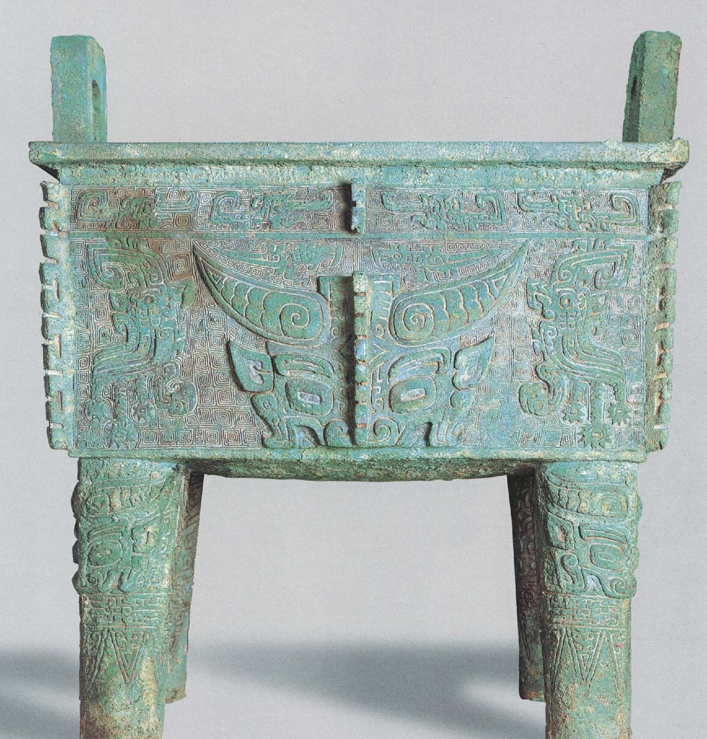 發跡於商王朝西陲的周人是商王朝的終結者,但他們和商人一樣,並不十分熱衷於在銅器上呈現牛這種動物。以國立故宮博物院典藏的〈鳳紋方座簋〉(圖12)為例,簋身和方座的紋飾為直棱紋、帶狀的鳳鳥與夔龍紋,只有簋耳和扉棱上裝飾了多重的牛首。雖然簋耳上的牛首層層疊疊,但牠們與鳳鳥、夔龍等典型銅器紋飾的分布涇渭分明,似乎暗示工匠對於如何將這種紋飾融入傳統並不很有把握。這樣的紋飾在西周早期曇花一現後,並未繼續流行,沒有進入周人的銅器傳統中。