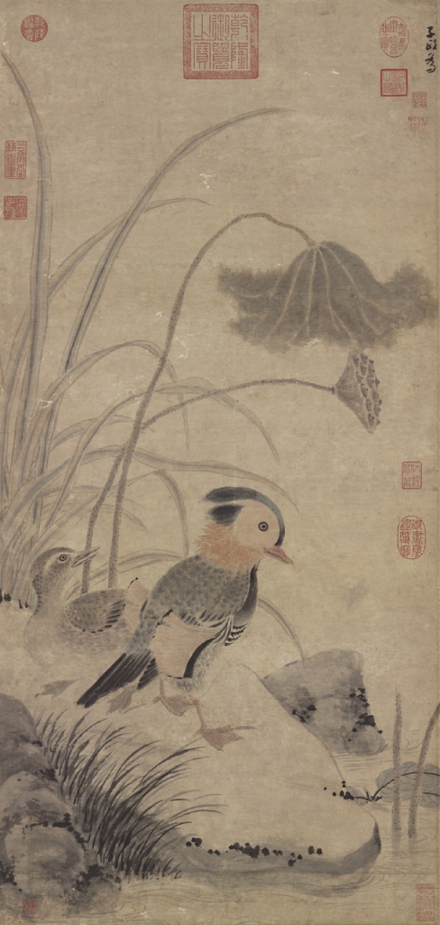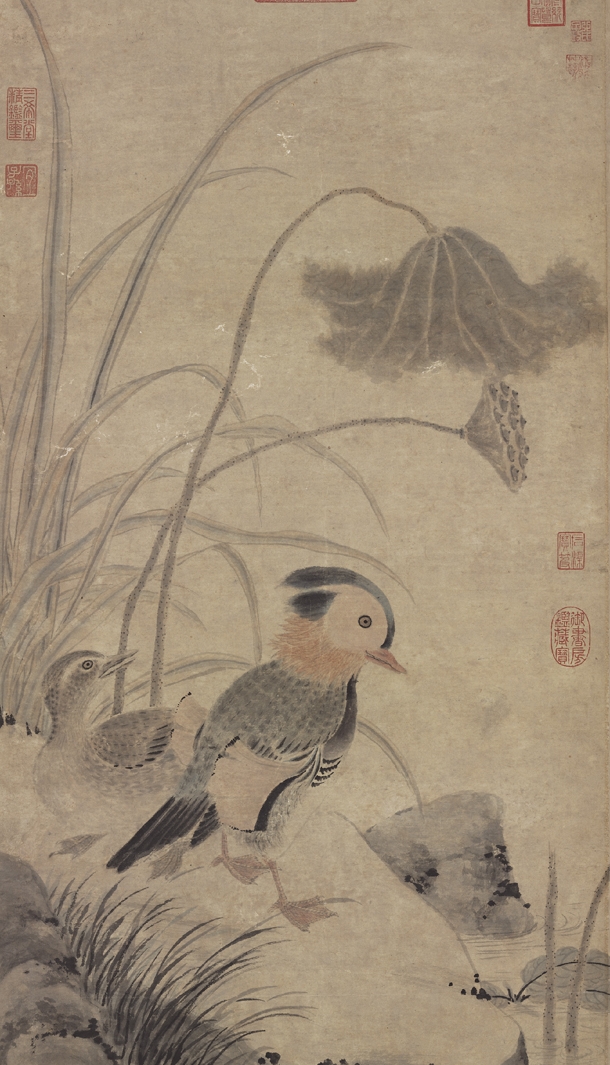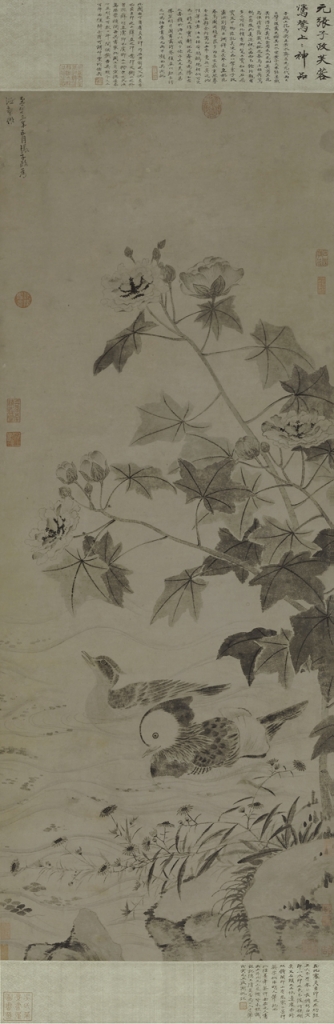 根據吳湖帆對於畫軸上印鑑的辨認,〈芙蓉鴛鴦圖〉從明代中期至晚期被沈周和文徵明的家族成員收藏於蘇州,清代進入皇室收藏。前面所提到的三幅張中花鳥畫都曾在乾隆皇帝手中。