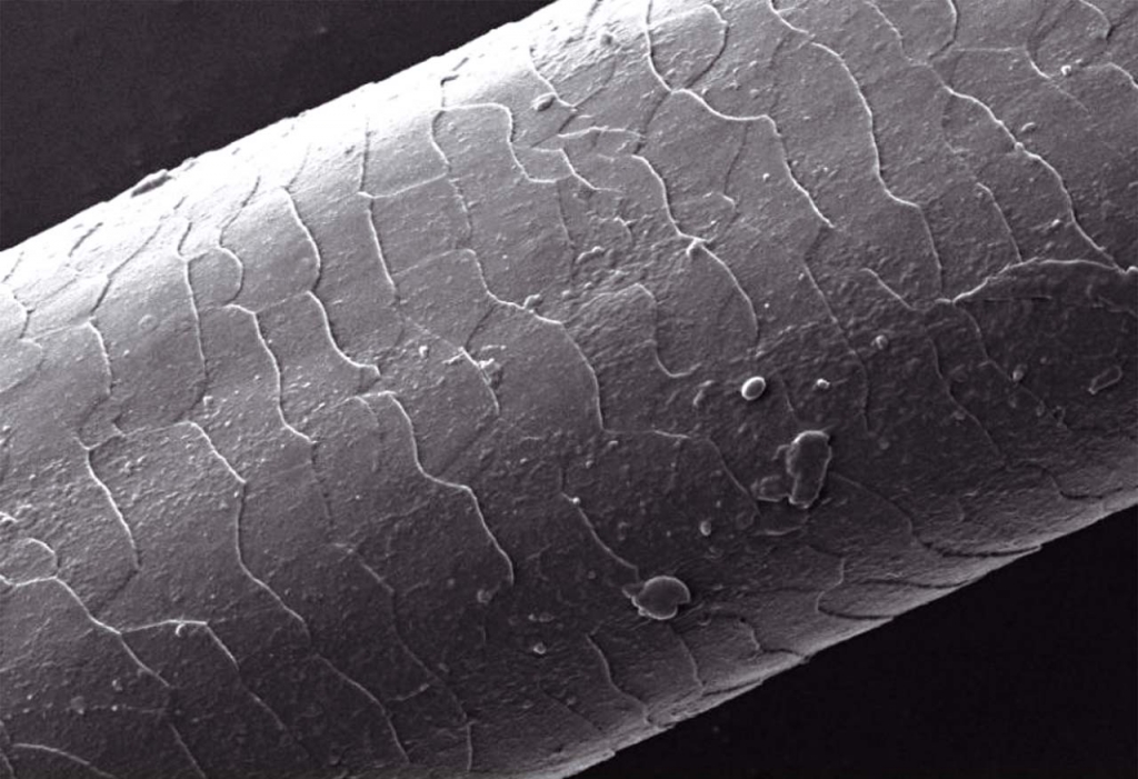 毛筆為獸毛所製成,其表面是由鱗片狀的角質細胞一層層堆疊出來(圖1),利用鱗片表面的附著力來吸附墨汁,然後靠著獸毛與書寫面接觸時,將附著於上的墨汁滲入書寫載體的纖維中。首先思考一根毫毛,當毫毛與書寫方向一致時,柔軟獸毛經過適當的施力加壓後,每個鱗片部位都能盡量地貼近書寫面,當接觸面積最大時,加上合適的停留時間,墨水便可以順利依序流入最大的量。然而,毫毛與行進方向出現角度時,鱗片排列方向便不同於毛筆行進方向,尤其當呈現垂直的角度時,因為獸毛的柔軟,加上施力加壓的方向與行進路線不同,很難讓每個鱗片服貼在面上,大概只有突起的鱗片外緣比較容易碰觸到書寫面,因此鱗片與鱗片的中間便會出現許多空隙,此時毫毛與書寫面的接觸面積大量縮小,注入的墨水量變少而且斷斷續續,導致整體的墨量大幅度減少。筆毫與書寫方向不一致也是造成飛白的主要原因。