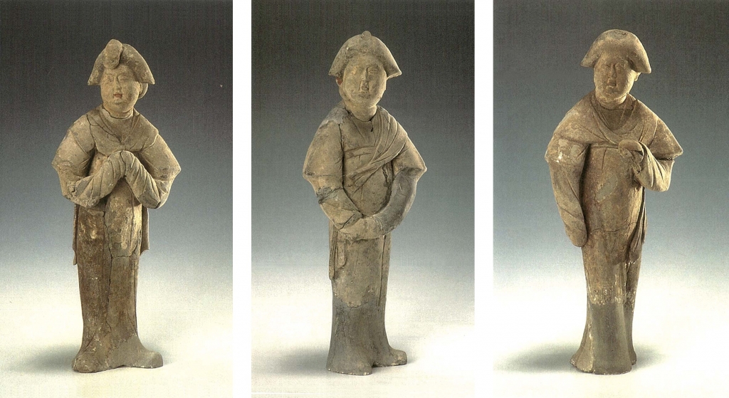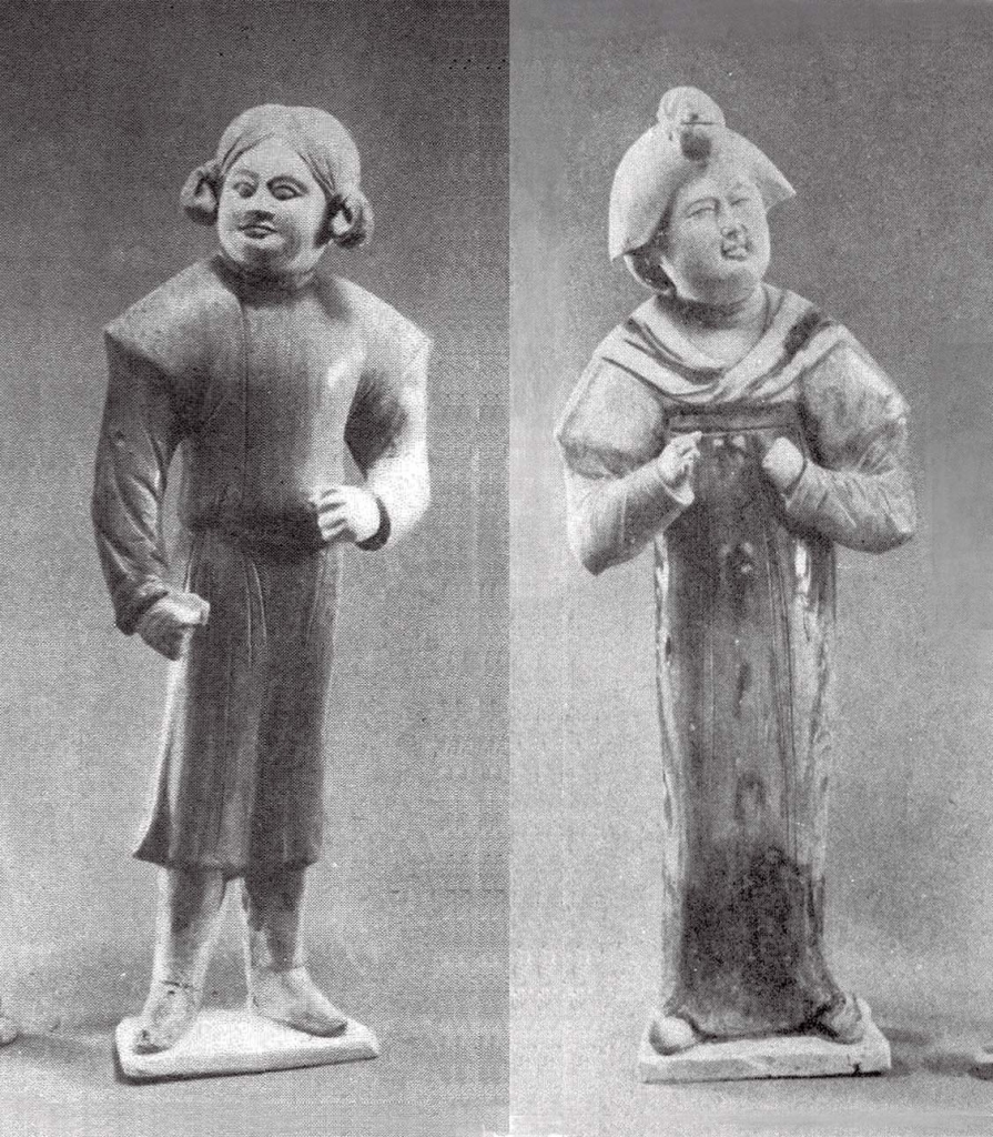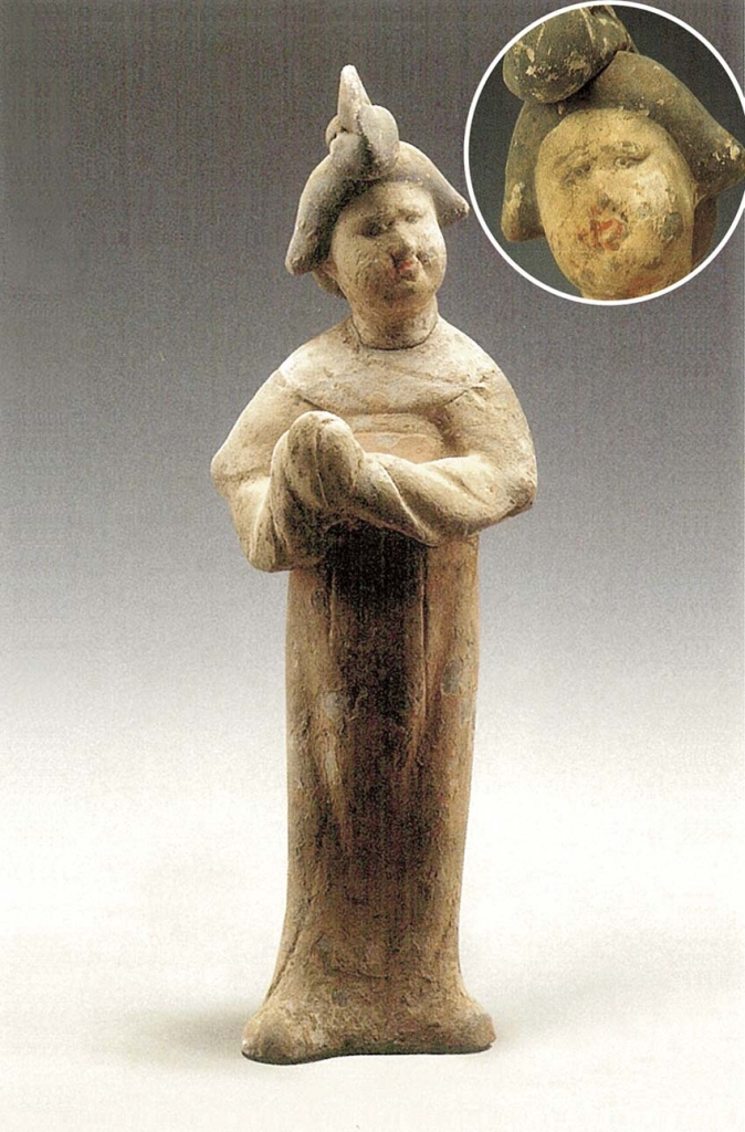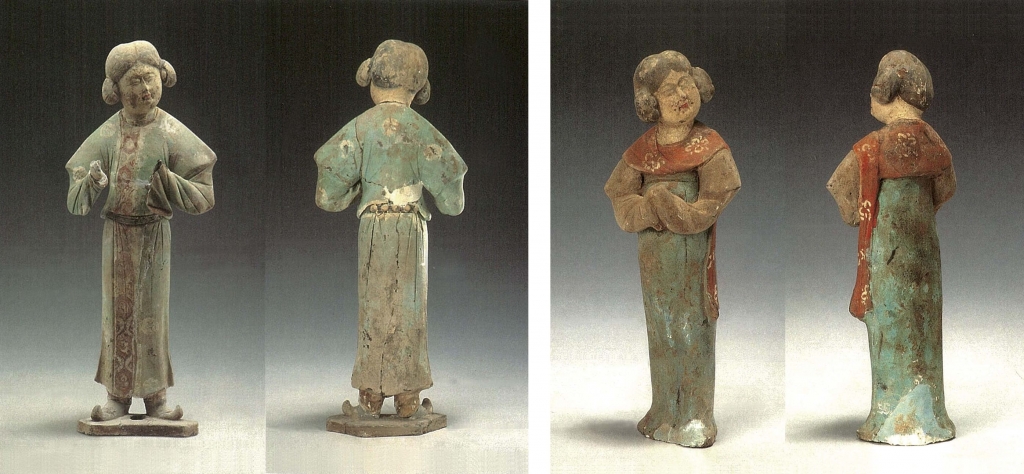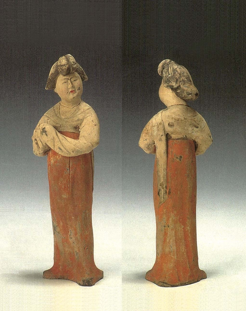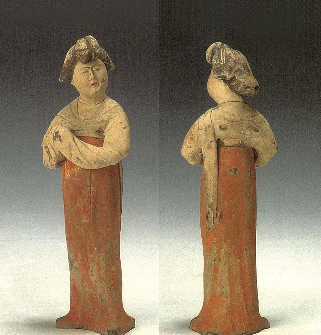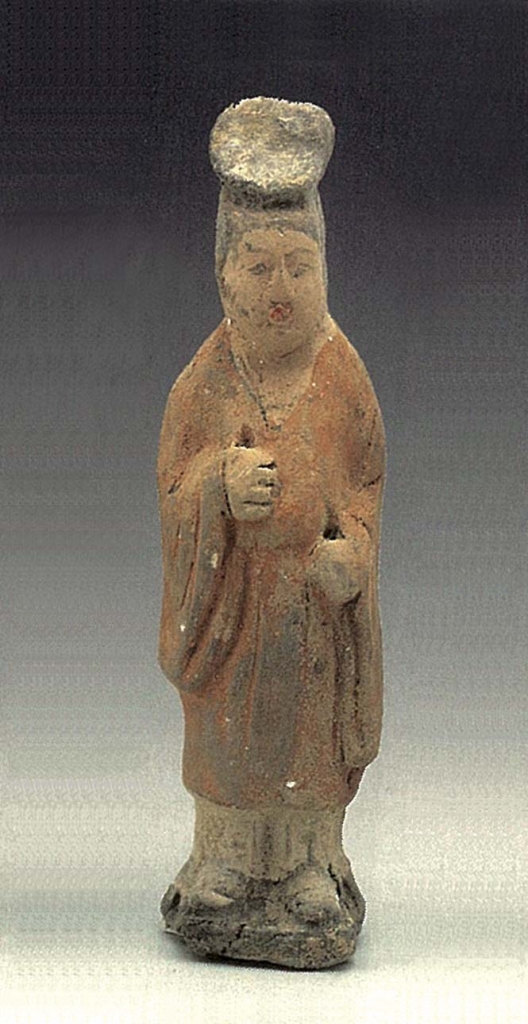 12.倭墮髻俑選介7件。標本93(圖20),體形肥碩。倭墮髻較大,垂於額頭,圓胖白臉,細眉小眼,眼珠有神,鼻翼稍寬,紅唇緊抿,內著半袖,外著白色窄袖襦,白帛環繞肩部,一端垂於左腰後,橘紅色曳地長裙高束腋下,袖手相握,舉物於右腹前,臉微揚,笑容含蓄,雙足外撇立於地。高25.5公分。標本70(圖21),體形肥碩。倭墮髻失,寬扁臉,眉毛略粗,眼瞼稍深,瞇眼,寬鼻,左嘴角上翹,內著半袖,外著紅色白團花窄袖襦,白色披帛自胸前搭向背後,各垂一側,綠色曳地長裙高束腋下,袖手抱物,置於右腹前,臉向左側上揚,一副無所謂的樣子,雙足外撇立於地。高25公分。標本62(圖22),體形瘦削。倭墮髻略揚,小圓臉,長眉,杏眼,鼻頭極小,紅唇緊抿,身穿綠色窄袖襦,肩披綠色長帛,一端垂於左腰後側,橘紅色曳地長裙高束腋下,足完全被遮掩。高18公分。標本121(圖23),體形略胖。倭墮髻與敷彩失,短胖臉,瞇眼,直鼻,小口,內著半袖,外著團領窄袖袍,腰束帶,背後有圓銙,下著褲、靴,身向左側,雙手舉於胸前,左手原持有物(殘),右手袖手,臉略右扭,冷面而視,雙足外撇立於馬蹄形底板上。高42.7公分。標本122(圖24),體形肥碩。頭梳倭墮髻,容貌同前,紅唇尚在,內著半袖,外著窄袖襦,披帛搭於肩上,帛端各垂一側,曳地長裙高束腋下,露出翹起的履尖,身向左側前傾,臉略右扭,袖手拱於腹前,畢恭畢敬,雙足外撇立於地。敷彩盡失。高40.3公分。標本123(圖25),體形肥碩。臉更胖,倭墮髻失,戴紅色耳套,繫於頸下,內著半袖,外著窄袖襦,肩搭披帛,前端掖於右臂下,後端飄垂左肩後,曳地長裙高束腋下,裙帶垂於右腰側,雙手相握於右胯前,側身前視,雙足外撇立於地。敷彩脫落。高40.6公分。標本120(圖26),體形肥碩。倭墮髻、敷彩失,胖臉,眼瞇成月牙狀,上唇較厚,內著半袖,外著窄袖襦,披帛自胸前搭於身後,帛端從左腰處飄出,曳地長裙高束腋下,右臂袖手低垂,右腿趨前,左臂袖手上擺胸前,眼視右前方作行走狀,姿態極為協調。高40.5公分。