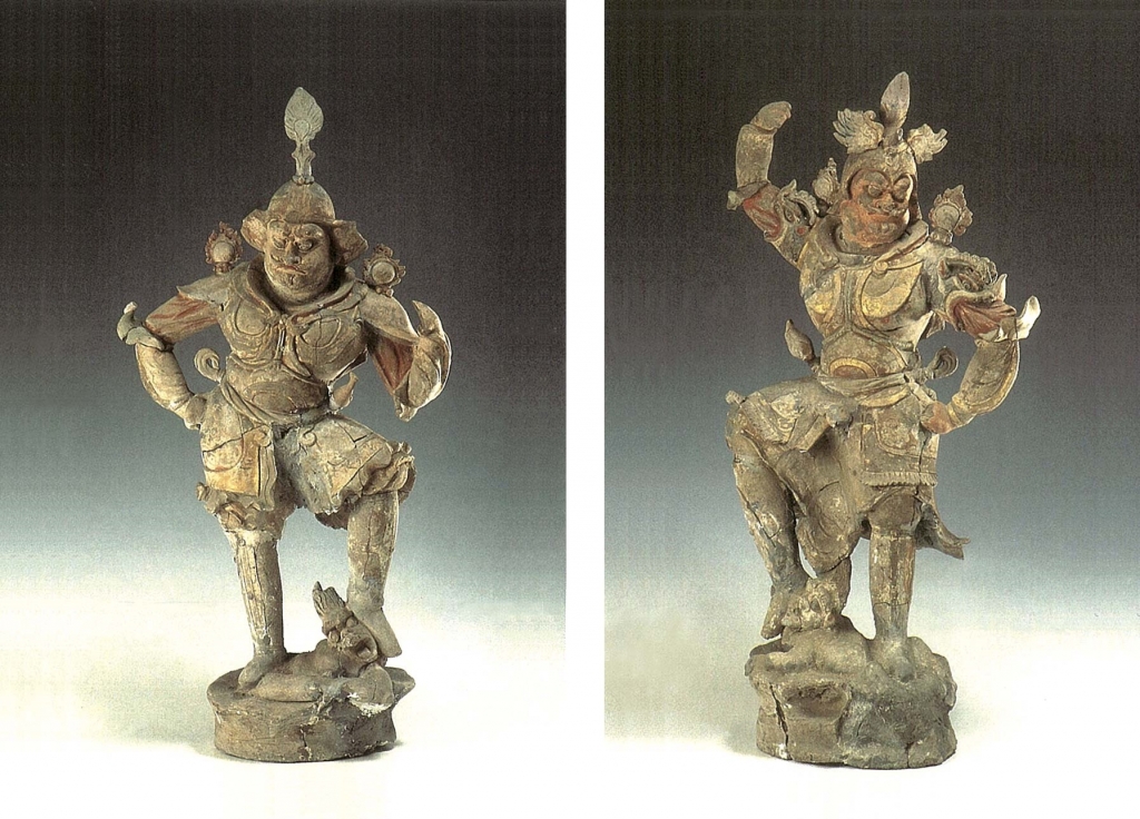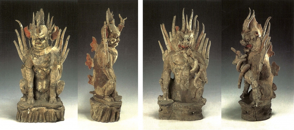 2.武士俑2件。標本110(圖4),圓胖臉,頭戴頂纓頭盔,護耳上翻,濃眉粗短,怪眼圓睜,塌鼻樑,高鼻頭,撅嘴,抿唇,唇上八字鬚高翹,肩披披膊,臂著雲口套袖、開口式臂褠,肩上有火焰狀寶珠,胸護圓形,腹護半圓,甲身繫滕蛇、腰索,腰索打結於腰側,腰索下有短蔽膝(殘),甲身內有飄裾襯裙,腿著膝褲,足著靴,右手扠腰,左手握拳半舉,腳踩小鬼,臉略右扭,愁眉苦臉,小鬼臥於橢圓形臺座上。通體塗白彩,局部塗紅彩,重要部位描金,惜多脫落。通高77公分。標本111(圖5),長臉,頭戴朱雀頭盔,粗眉,凸眼,高鼻,抿嘴,八字鬚,肩披龍首披膊,著雲口套袖、開口式臂褠,肩上有兩個火焰狀寶珠,甲身、襯裙、膝褲同前,左手扠腰,右手握拳上舉,腳踩小鬼,面左怒目而視,小鬼臥於中空臺座上。塗彩方法同前,重要部位描金尚在。高74.4公分。