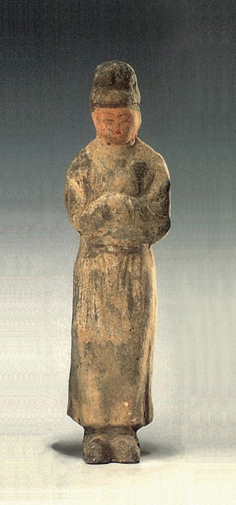 9.幞頭女俑6件。標本62(圖16),頭戴黑色幞頭,面目紅潤,細眉細眼,小鼻小口,身著白色團領窄袖袍,腰束黑帶,足著褲、黑靴,拱手立於地。高17.5公分。