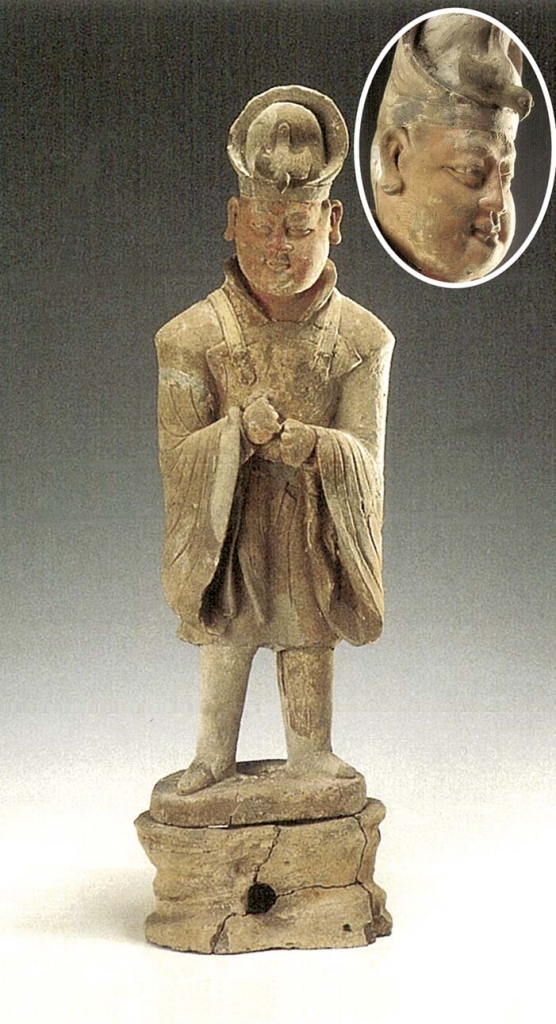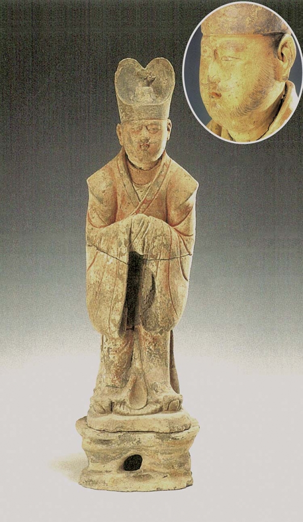 3.文官俑1件。標本117(圖6),頭戴黑色進賢冠,圓臉方耳,寬眉細眼,秀鼻小口,唇上及兩腮描有很細的八字鬚及絡腮鬍鬚,內著白色半袖,外著紅色右衽闊袖襦,褾、襈飾白色雲紋,腰束帶,下著紅裙,腿間垂飄帶,足著方頭履,拱手立於桃形底板上,其下有中空岩座。臉紅色,袍色多有脫落。通高60.4公分。