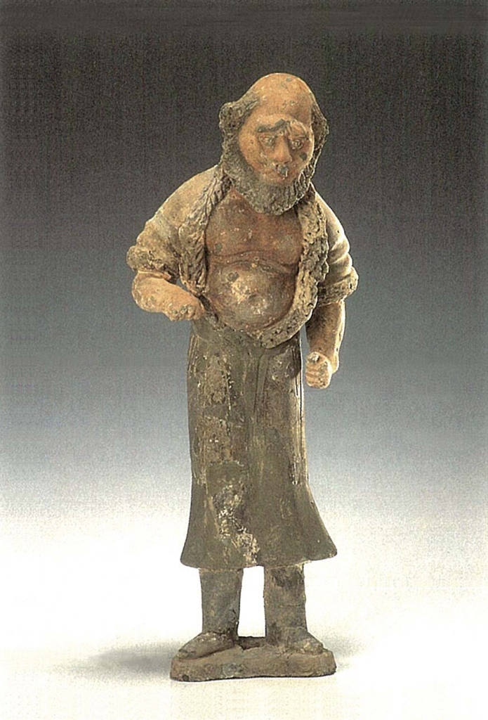 5.牽駝俑1件。標本113(圖8),長臉,顱頂高起,禿髮,顱下卷髮與絡腮鬍相連,八字眉,凸眼珠,長鼻高起,兩頰凸出,嘴略張,上有短髭,身穿黑色開領卷毛長袍,腰纏包裹,坦胸露腹,雙乳下垂,下著褲、黑靴,雙手半舉作握韁狀,雙足外撇,立於梯形底板上,頭略低,兩眼直視駱駝。頭臉、胸腹、手臂塗褐紅彩,眉鬚、卷髮塗黑彩,嘴塗紅彩,袍色多脫落。高40.5公分。