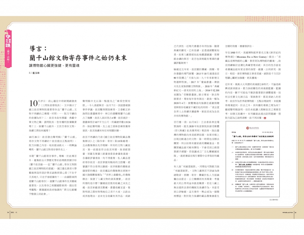 本期「蘭千山館寄存事件」專輯,於此導言外,邀集政治大學歷史學系助理教授劉宇珍〈蘭千故宮緣──記「蘭千山館」寄存文物對國立故宮博物院的意義〉、國立臺北教育大學藝術與造形設計學系副教授黃心蓉〈不在乎天長地久 只在乎曾經擁有?──由國際案例看蘭千山館寄存〉,就蘭千山館事件及其藝術重要性,以及寄存之相關國際案例,提出思考觀點,實踐國家政府強調的「將文化賦權予整個公民社會」。