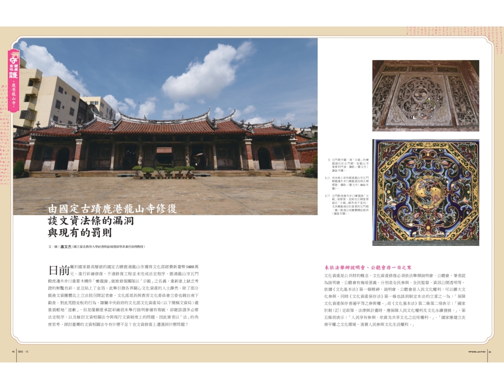 (完整圖文請見《典藏.古美術》第363期12月號〈由國定古蹟鹿港龍山寺修復談文資法條的漏洞與現有的罰則〉,作者:蕭文杰)