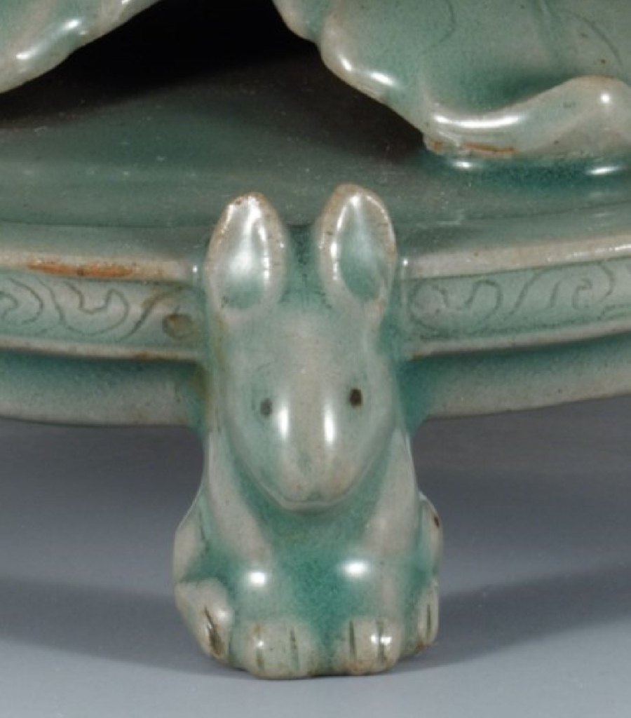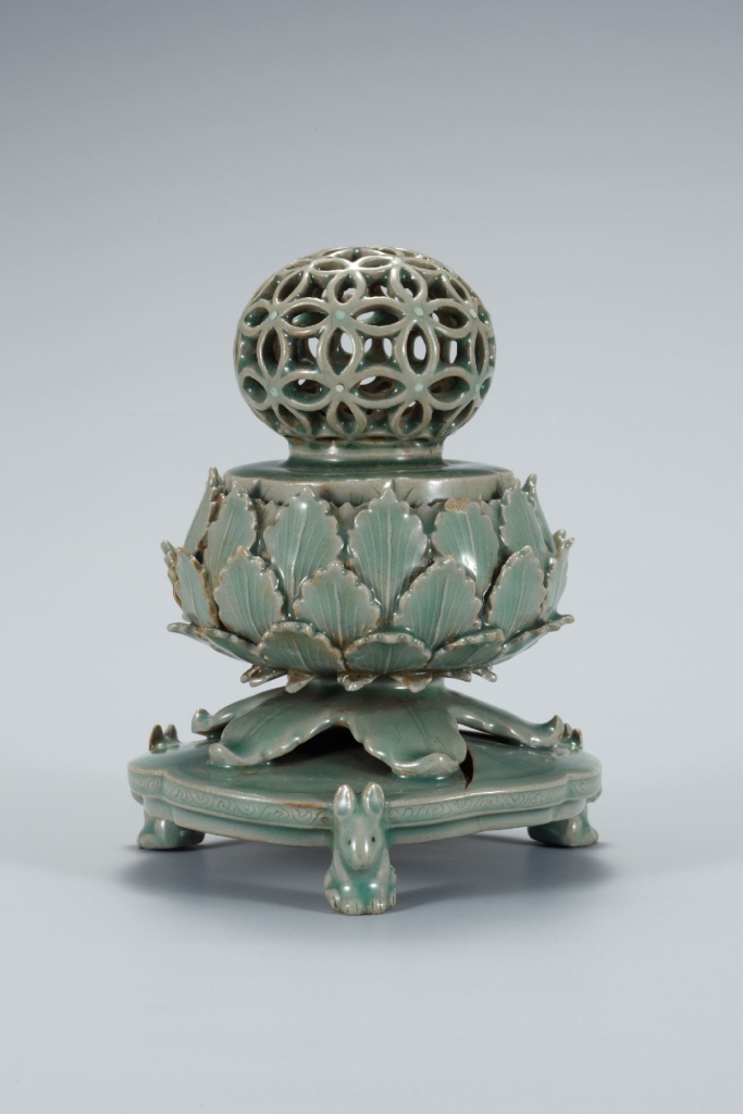 〈青磁透刻七寶文香爐〉品名中的韓文漢字「文」通「紋」,香爐由可分離的爐蓋和爐身兩部分組成,爐身的上半部呈仰蓮狀,由多層蓮瓣包裹,再由巨大的蓮葉支撐著,底部則為作成由三隻兔子背負的台座造形,側面刻有卷草紋,兔子的雙眼用黑色點就。釉色為高麗青瓷中經典的翡色,帶有淡淡的光澤,此品可能是為佛教目的而製成的高麗前期青瓷精品。