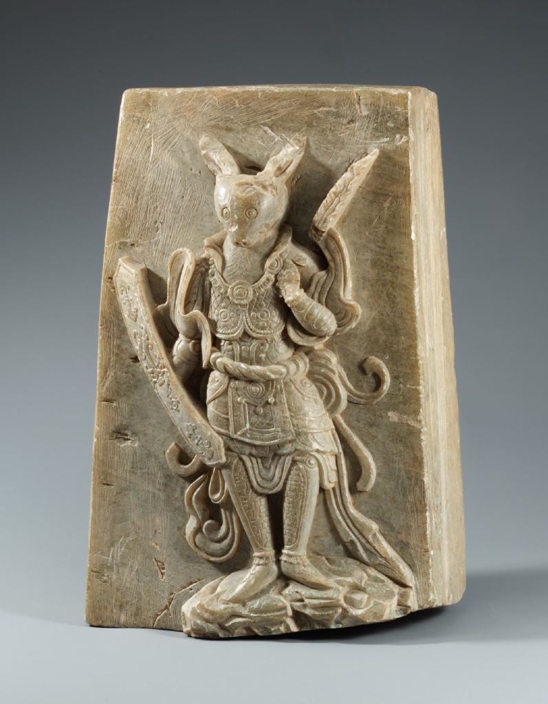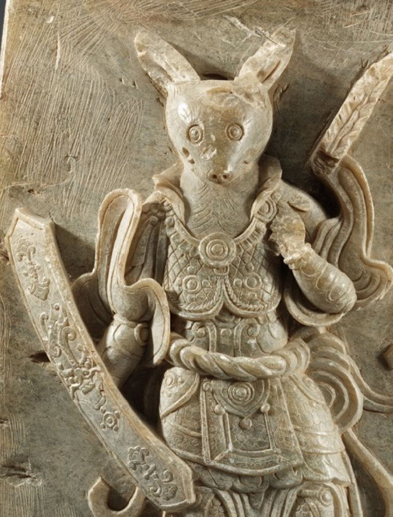 韓文中「十二支」代表十二生肖,至於十二生肖如何傳入韓半島的至今尚未得知,亦無任何相關記載,目前韓國學者推測下限是新羅聖德王陵的建造年(西元736年左右),認為從統一新羅時代(676-935)起便開始出現用於佛教文物遺址的十二生肖圖像或造形,並逐漸發展至建築、繪畫、工藝品,乃至日常生活用品,廣為流行。〈十二支兔子像〉又稱「骨石制子像」或「蠟石制卯像」。此兔子披著盔甲,一隻手拿著刀,被認為是作為陵墓守護神的生肖像之一。而統一新羅時代陵墓中亦埋有土牛或小型的十二生肖像。