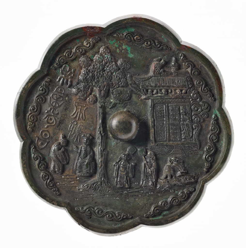 高麗鏡以多紐細文(紋)鏡為主,大致可分為三種;一、中國或外國輸入;二、高麗製造;三、高麗模仿中國的仿製鏡或踏返鏡(以原件鏡做外範後再重灌入金屬製成)。〈銅制銘文菱形鏡〉用樹木、房子和人物等圖案裝飾,銘文「帝孫○昌會造」,推測為描繪仙境世界的高麗鏡。鏡子中出現搗藥的玉兔源自於中國西周的「玉兔搗藥」傳說,以此作為表現仙境的元素之一,可知高麗時代亦有與唐代玉兔銅鏡(如國立故宮博物院藏中唐〈月魄菱花鏡〉)在主題上有異曲同工之妙的作品。