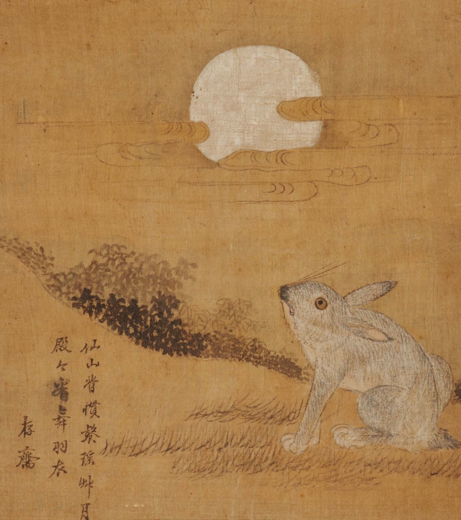 自古以來,兔子在月宮搗藥,被認為是製作長生不死丹藥的靈獸。朝鮮時代19世紀〈月下白圖〉描繪著豎起兩隻耳朵的兔子遙望天上的圓月,在畫面左下角的題跋文如下:「仙山晉慣饗瑤草,月殿今看舞羽衣,存齋。」「存齋」推測為作者字號,目前尚未能得知作者身分。