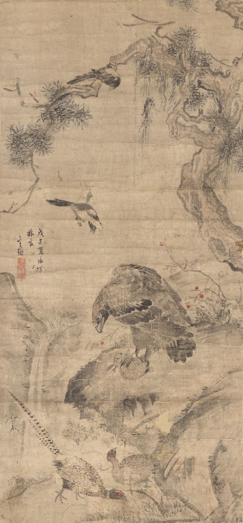 朝鮮後期畫家沈師正(1707-1769)出身名門世家卻畢生未任官職,沉浸於畫業,曾于真景大家鄭敾(1676-1758)門下學畫,透過來自中國的畫譜習得浙派及南宗畫風,與李麟祥(1710-1760)和姜世晃(1713-1791)等人被評為18世紀畫壇重要的「朝鮮式南宗畫家」。他的〈豪鷲搏兔圖〉左側中間部分寫著「戊子夏仿寫林良」題跋,由此可知這是沈師正於1768年夏季模仿明代畫家林良(1428-1494)的作品。此畫呈現的是一隻目光犀利的鷹捕捉兔子的緊張瞬間,與畫面給人的緊迫感不同的是山坡上畫了雜草、菊花以及紅色果實,充滿趣味。技法方面,以水墨濃淡的恰當運用、用筆以側鋒快速拖拽勾畫出岩石棱角的斧劈皴等,此特點恰與浙派畫風的林良相仿。而細緻描畫的山雞和兔子、松樹上的乾筆則接近朝鮮式的南宗畫風,反映出沈師正畫風的複合性。