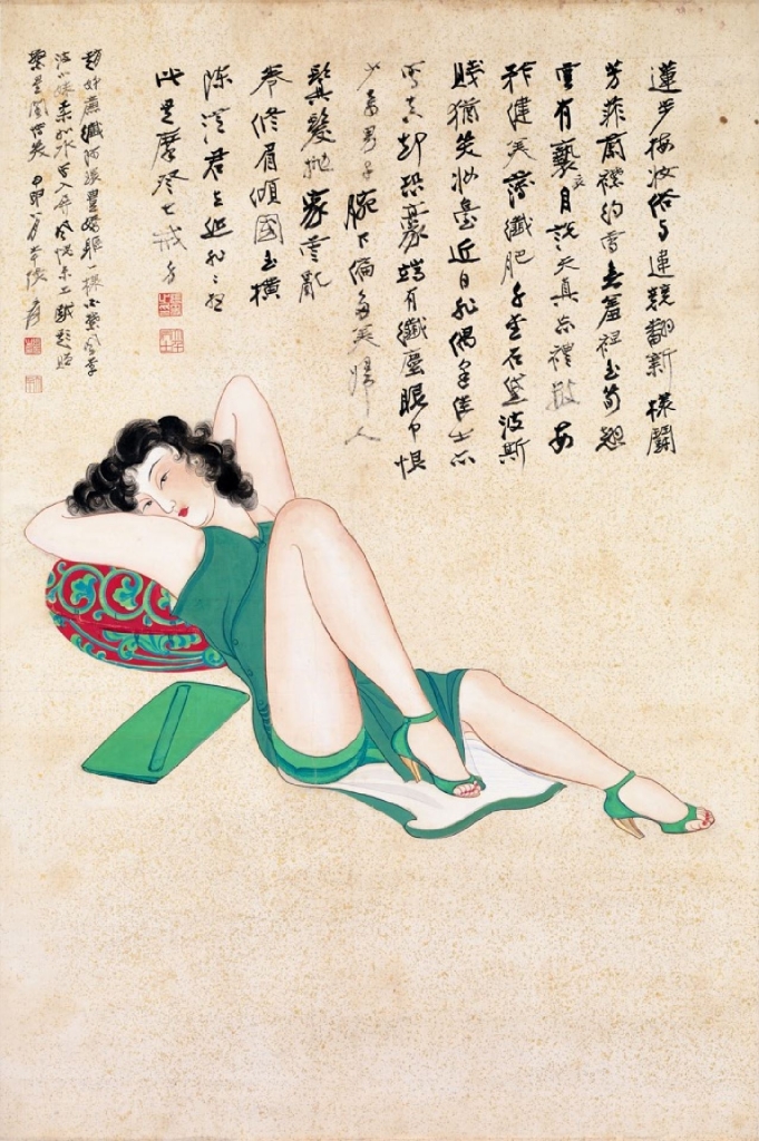 1944年,張大千前後寫繪了數件重彩仕女或女性歷史人物作品。他於1941年6月開始臨摹敦煌壁畫,對敦煌佛像人物造形、線條乃至設色的瞭解與體會,如其畫中裝飾性的華麗紋飾與色彩層次飽滿多變的礦物彩敷色,為其藝術表現開展出豐富多元的面目。基此,早期張大千擅繪的明清仕女之柔女子形像,經過敦煌洗禮之後,轉變為敦煌佛壁畫的線條用色,礦物顏料的厚重豐實感,使工筆仕女人物畫變得雍容華麗。此作的畫中仕女呈仰躺之姿,身著翠綠旗袍,兩臂環首為枕,髮浪如波,倚於紅底綠花之圓枕上,帶有慵懶嬌柔之態。畫款兩段,前段先錄七律二首,「蓮步梅妝俗與違,競翻新樣鬪芳菲,蘭襟約雪無羞袒,玉筍翹雲有褻衣。自說天真忘禮數,每矜健美薄纖肥,千金石黛波斯賤,猶笑妝臺近日非。」為其一,直寫此畫中女子姿態與妝容與當年保守時代的世俗價值觀有別,可謂點題之言。其後接「偶逢佳士亦寫真,却恐豪端有纖塵,眼中恨少奇男子,腕下偏多美婦人。鬒髮拋家雲亂卷,修眉傾國玉橫陳,從君去作非非想,此是摩登七戒身。」一段,自陳喜寫美人之好,最後話鋒一轉,「從君去作非非想,此是摩登七戒身。」文中「摩登」是取自英文「modern」之意,而「戒體」則以佛家觀念來作其「欣賞美人」同時修習佛法「定」、「靜」之「修練」作解,內容詼諧智慧。以新臺幣8000萬元起拍,最終落槌在1億9500萬元,成交價為2億3000萬元。