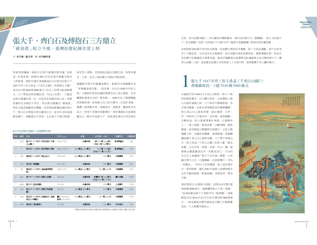 即便疫情趨緩,2022年近現代書畫市場仍處「長新冠」的復原期。相較於2021年的近現代書畫市場有三席破億,2022年僅有香港蘇富比4月推出的張大千1947年作〈仿王希孟〈千里江山圖〉〉突破億元大關, 成交在3億7049萬5000港元(約合人民幣3億2580萬元,以下幣值未特別標註者,均為人民幣),不僅是近現代書畫的第一名,亦是所有拍賣品項之冠。即便拍賣成交金額並不突出,然近現代書畫的「硬資產」特色引起高端藏家的興趣。年初春拍斬獲佳績的張大千、齊白石及傅抱石吸引藏家目光,並在年末的高通膨危機下,更願意出手爭取,尤以張大千傲立群雄, 深受眾人青睞,在香港拍出億元高價之後,秋季在臺北、上海、北京三地拍賣公司都有亮眼表現。
