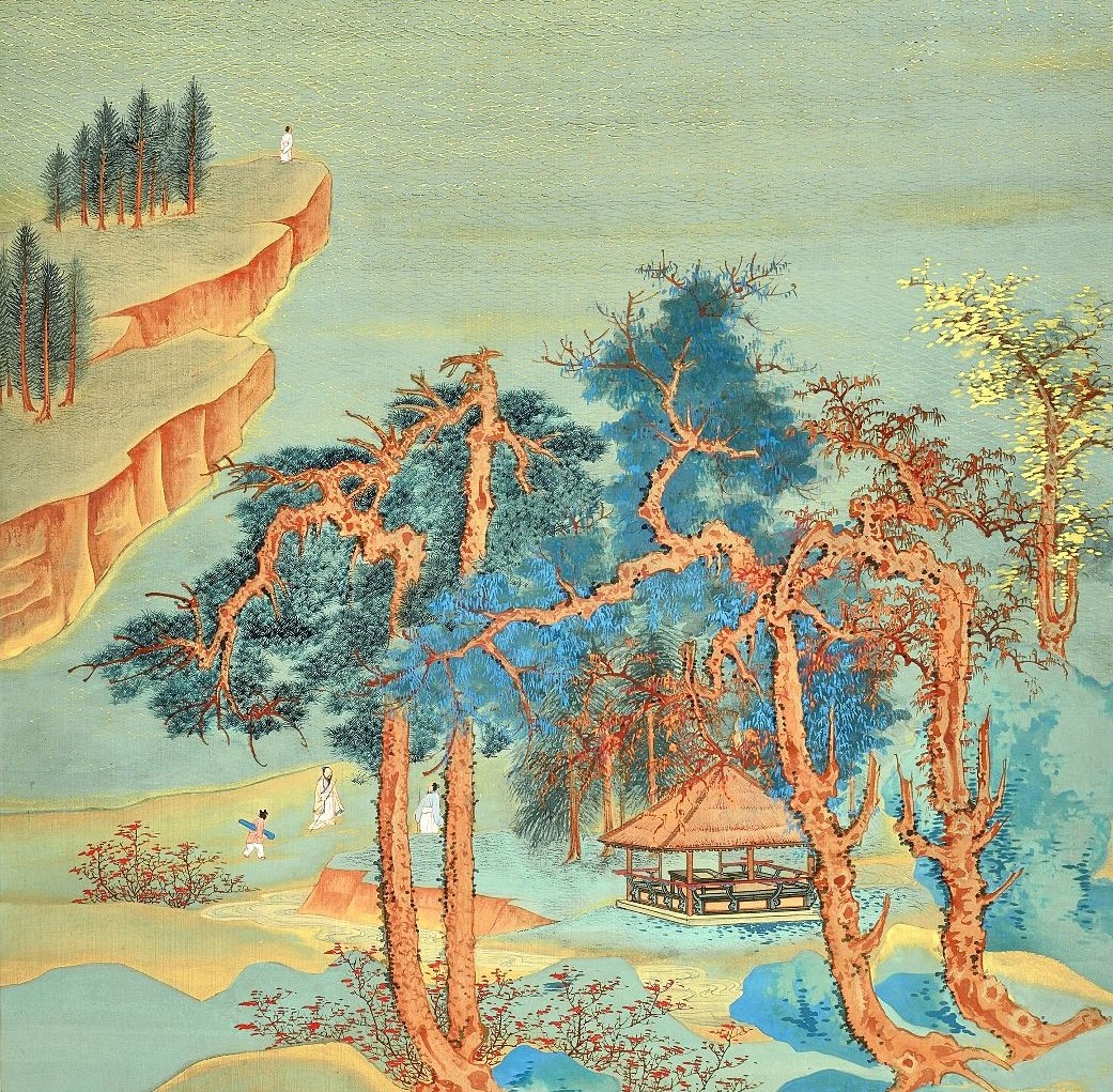 本幅創作於1948年1月至2月期間,時大千寓居成都昭覺寺,目力體力俱佳,正值傳統工筆山水創作最盛之時。大千取四尺整幅素絹,改 手卷為條幅,並捨去原卷標誌性的層巒疊嶂,取江南山水之綿延秀潤,遠法董源、巨然,作一河兩岸之平遠布局:近岸處,溪流蜿蜒,古樹虬曲,高士偕童僕漫步林蔭;左側岬角上,一高士遠眺,碧波浩渺,沙鷗迴翔,帆影漸遠;彼岸綿延山巒籠罩在落霞中,正是日暮雁歸之時。全圖布局嚴謹,意境閒適,直幅構圖益顯千里江山之蒼莽浩瀚。大千筆下青綠山水,取王希孟〈千里江山圖〉長卷入畫,僅見此幅,且以沒骨、青綠、金碧,共冶一爐,細筆鉤金覆蓋畫面近半,恐僅此而已。只為同年五月上海畫展「張大千近作展」精製,示其融古開今之功,已臻巔峰。在該展覽中,列為「非賣品」,可知大千自珍寶愛,後入孫志飛手中,奉若拱璧,僅於1983年借展上海博物館及北京中國美術館,睽違40載,再度面世,殊為可貴。