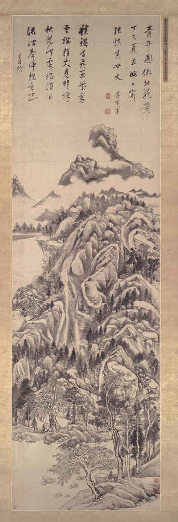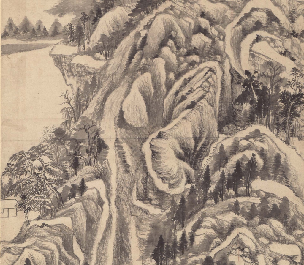 董其昌的〈青弁圖〉作於62歲,弁山位於王蒙的家鄉吳興,亦稱卞山。董其昌曾收藏過王蒙〈青卞隱居圖〉,此圖即借用了〈青卞隱居圖〉的圖式,自題則說「仿董北苑筆」,實則雜糅董源的披麻皴、米氏的米點皴。相較於郭熙〈早春圖〉那般可以游的世界,〈青弁圖〉的空間結構複雜,右側山體由破碎的小單位組成,小徑曲折難行,難以找到立足之地。由諸多緊湊的視覺符號,可感受到董其昌對筆墨效果的喜愛。