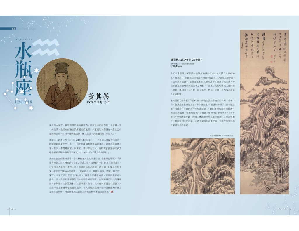 說到水瓶座的獨特思考,令人想到董其昌的南北宗論,《畫禪室隨筆》:「禪家有南北二宗,唐時始分;畫之南北二宗,亦唐時分也。但其人非南北耳。北宗則李思訓父子著色山水,流傳而為宋之趙幹、趙伯駒、伯驌以至馬夏輩。南宗則王摩詰始用渲淡,一變鈎斫之法,其傳為張璪、荊關、郭忠恕、董巨、米家父子以至元之四大家。」董其昌以禪宗喻畫,將歷代畫家分為南北二宗,北宗以李思訓為首,南宗追溯到王維,此說獲得同時代的陳繼儒、詹景鳳、沈顥等附和,影響深遠。然而,現今重新審視南北宗論,其分法不完全依據風格或畫家出身,令人質疑到底是不是一個嚴謹的系統?這般奇思妙想,可能需要對上董其昌的電波頻率才能完全參透。