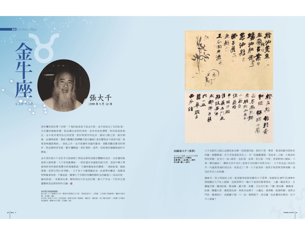 金牛座的張大千在許多方面展現了對高品質和高感官體驗的追求,光是畫材就值得大書特書。大千來到臺灣後,一度苦惱沒有滿意的紙可用,直到中興大學森林研究所教授張豐吉研發鳳梨紙,方獲得藝術家的讚賞:「滑能駐毫,凝能發墨,直與元明以來爭勝」。大千也十分鍾愛羅紋宣,此紙帶有簾紋,能製造特殊暈滲效果。不僅是紙,據傳大千早期所用礦物顏料為西藏進口(或由印度、緬甸原產),來臺後毛筆、顏料則向日本名店訂製。賞大千作品,不妨多注意畫藝與高品質材料的交融。