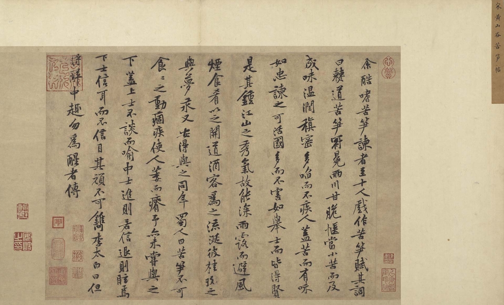黃庭堅提到,筍苦而有味,就如忠諫對於國家有益一般;苦筍多吃無害,如同多舉士人,得到的都是賢士。一般人不懂這苦筍的奧妙,只好自享其美味,似乎將自己比喻為了不被世人理解的忠賢。本帖書風屬於較規整的小行書,行距特別寬,似有受到五代楊凝式〈韭花帖〉影響。