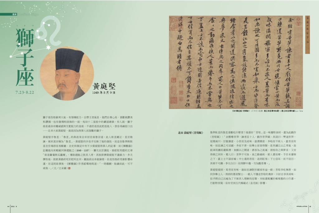 獅子座性格豪爽大氣,有領導能力,自帶王者氣息。他們自尊心高,喜歡被讚美和讚揚,也有傲慢和固執的一面,宛如十二星座中的霸道總裁。有人說,獅子座是最具有權威感與支配能力的星座,不過若是因此貶低他人,很容易禍從口出──北宋大家黃庭堅,就是因為得罪人而落難的獅子。