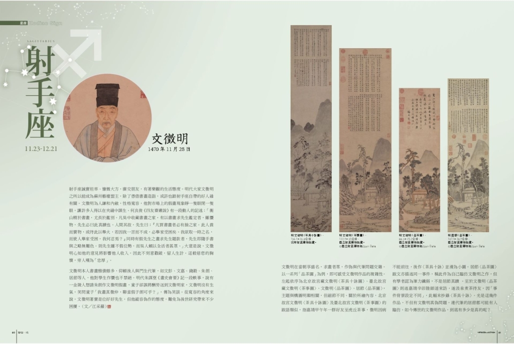 射手座誠實坦率、慷慨大方,廣交朋友,有著樂觀的生活態度。明代大家文徵明之所以能成為蘇州藝壇盟主,除了憑借書畫造詣,或許也跟射手座自帶的好人緣有關。文徵明為人謙和內斂,性格寬容,他對市場上的假畫現象睜一隻眼閉一隻眼,讓許多人得以在夾縫中謀生。何良俊《四友齋叢說》有一段動人的記述:「衡山精於書畫,尤長於鑑別。凡吳中收藏書畫之家,有以書畫求先生鑑定者,雖贗物,先生必曰此真蹟也。人間其故,先生曰:『凡買書畫者必有餘之家。此人貧而賣物,或待此以舉火,若因我一言而不成,必舉家受困矣。我欲取一時之名,而使人舉家受困,我何忍焉?』同時有假先生之畫求先生題款者,先生即隨手書與之略無難色。則先生雖不假位勢,而吳人賴以全活者甚眾。」大意是說,文徵明心知他的意見將影響他人收入,因此不刻意戳破,留人生計。這般慈悲的胸懷,旁人嘆為「忠厚」。