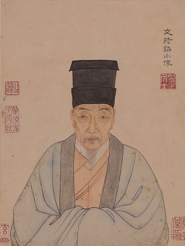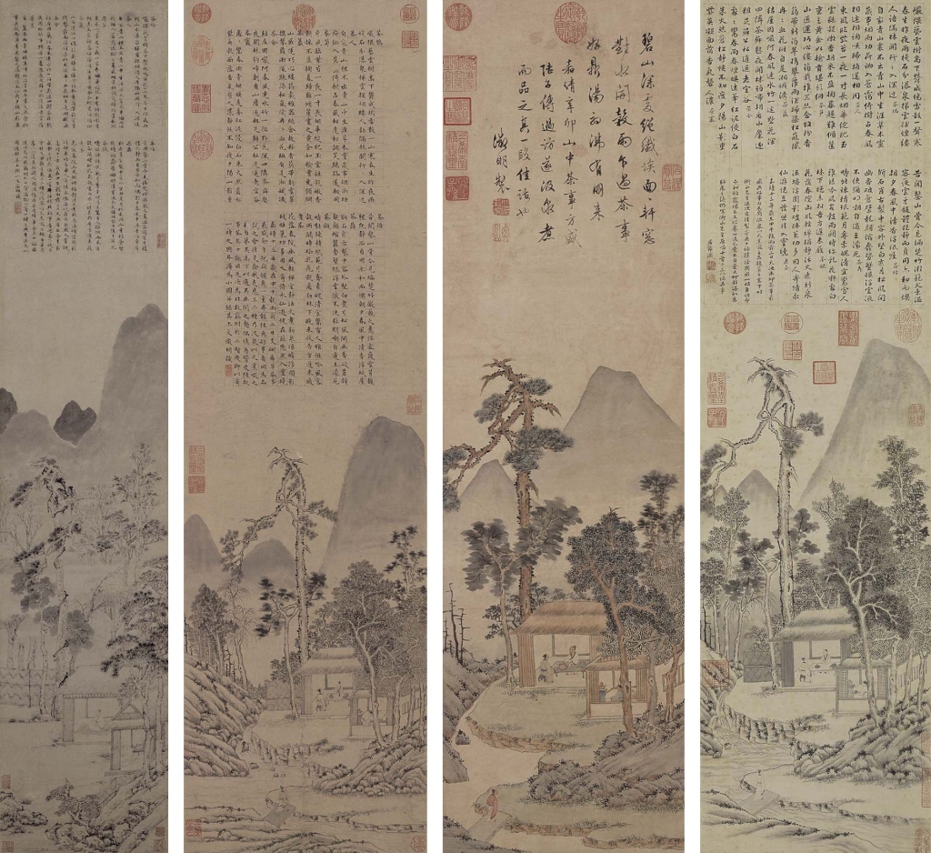 文徵明在當朝享盛名,求畫者眾,作偽與代筆問題交雜。以一系列「品茶圖」為例,即可感受文徵明作品的複雜性。左起依序為北京故宮藏文徵明〈茶具十詠圖〉、臺北故宮藏文徵明〈茶事圖〉、文徵明〈品茶圖〉、居節〈品茶圖〉,主題與構圖明顯相關,但細節不同。關於所繪內容,北京故宮文徵明〈茶具十詠圖〉及臺北故宮文徵明〈茶事圖〉的跋語類似,指嘉靖甲午年一群好友至虎丘茶事,徵明因病不能前往,後作〈茶具十詠〉並漫為小圖。居節〈品茶圖〉跋文亦描述同一事件,稱此件為自己臨仿文徵明之作,但有學者認為筆力纖弱,不是居節真蹟 。至於文徵明〈品茶圖〉則述嘉靖辛卯陸師道來訪,遂汲泉煮茶待友,因「事件背景設定不同」,此幅未抄錄〈茶具十詠〉。光是這幾件作品,不但有文徵明真偽問題,連代筆的居節都可能有人臨仿。如今傳世的文徵明作品,到底有多少是真的呢?