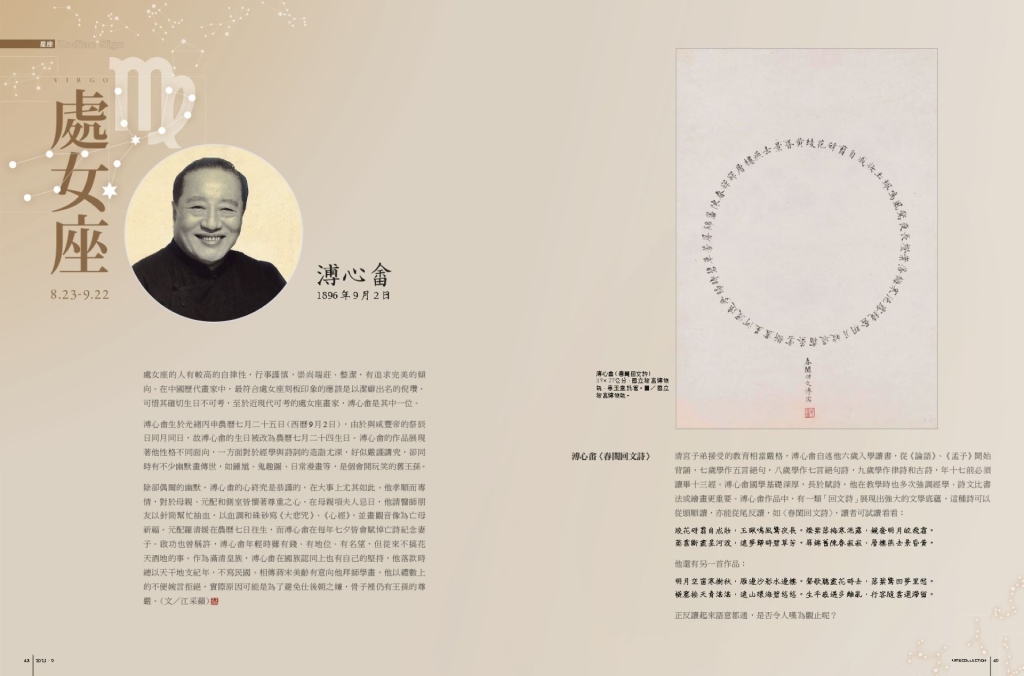 處女座的人有較高的自律性,行事謹慎,崇尚端莊、整潔,有追求完美的傾向。在中國歷代畫家中,最符合處女座刻板印象的應該是以潔癖出名的倪瓚,可惜其確切生日不可考,至於近現代可考的處女座畫家,溥心畬是其中一位。