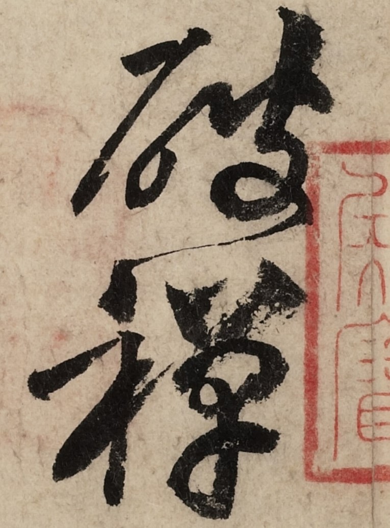 開頭「花氣薰人欲」五字,寫來中規中矩,線條圓潤飽滿,不愧山谷手筆。到了「破禪」二字,或許已經牽動其平靜的思緒,開始出現不太修飾的線條,「單」用筆上益顯急躁。換行書寫「心情」又是嶄新的開始,只是來到「其實」又出現毛躁用筆,「實」字許多處連圓潤的基本品質都失去,不穩定的狀況持續到「詩思」。線條的隨意與敷衍,顯示出書寫時內心的抗拒感,可以清楚感受到黃庭堅心中那股不願、煩躁與厭惡的心情。尤其是「年」字,第一撇完成後,豎畫起筆後的轉鋒提筆太過,使得筆畫偏細,底部往左下的書寫動作先是略顯猶豫,之後向上帶筆又過於粗壯,視覺上形成虛實不分的狀況,最終收筆動作也是草草結束,未能確實完成動作。這樣的書寫品質,鮮少出現於黃庭堅傳世書跡中,必然有其存在的理由。