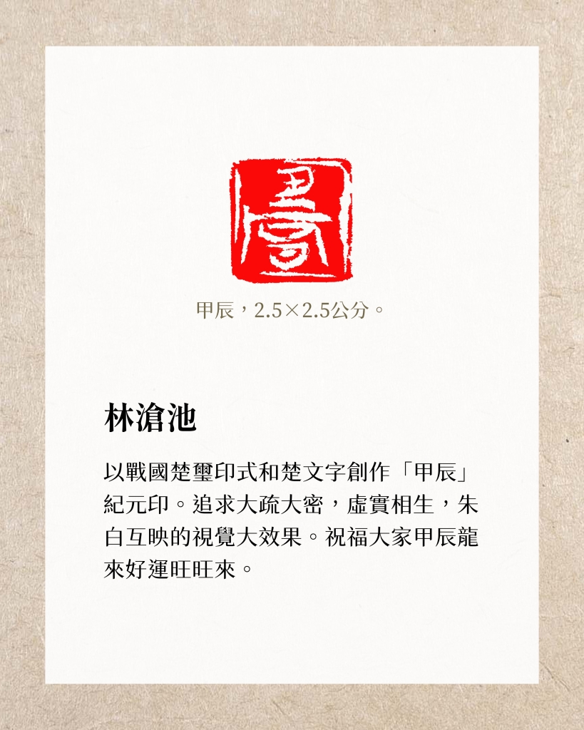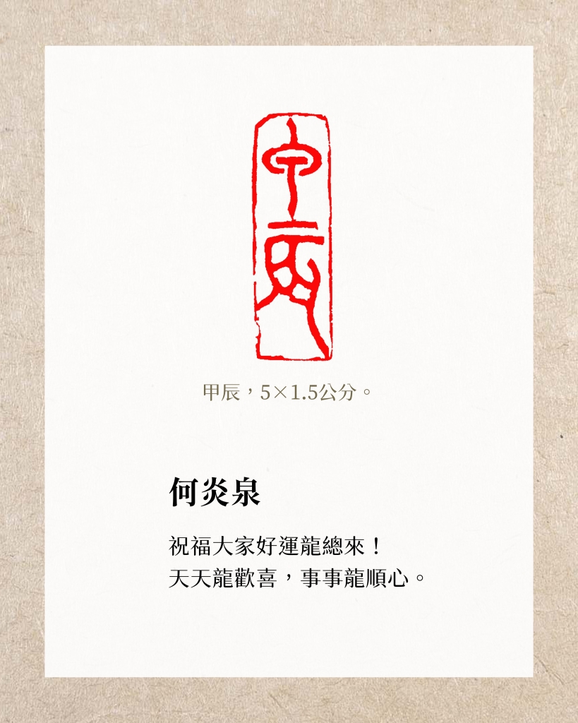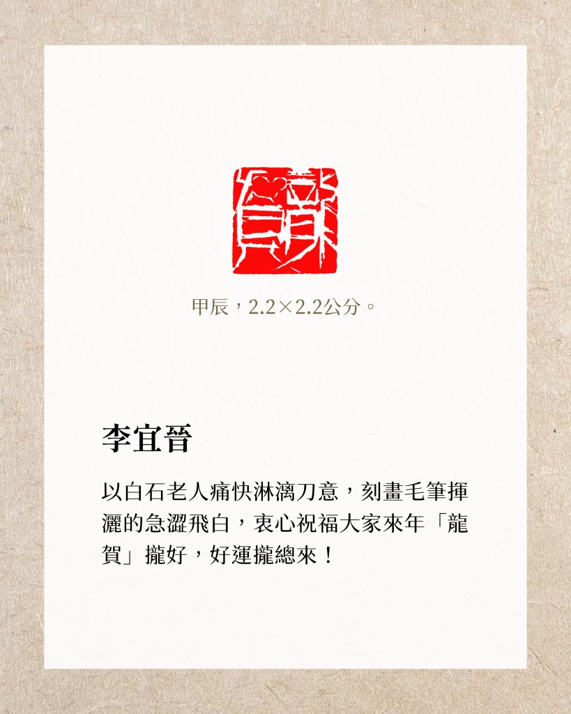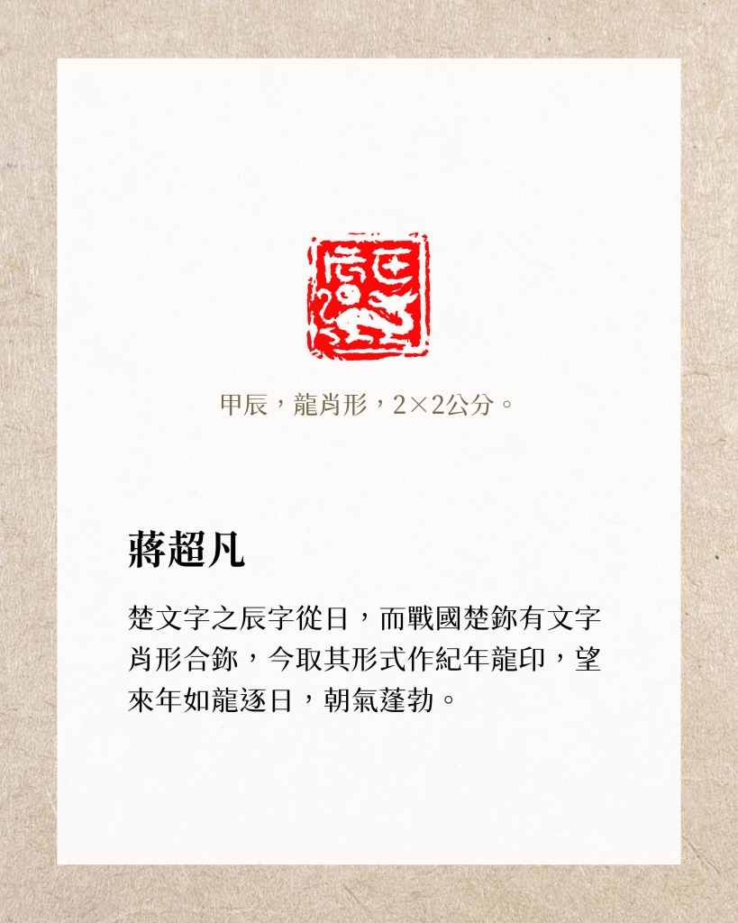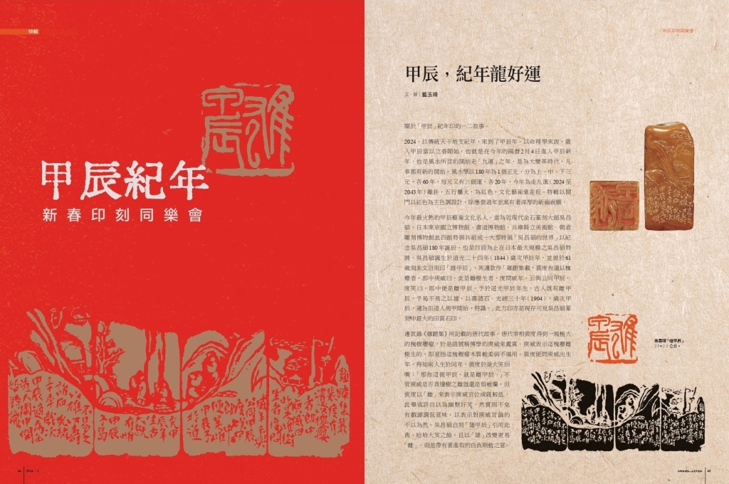 本特輯邀集印友們,以「甲辰」紀年印或「龍」肖生印為主題,無分老中青世代,以齒齡為排序,自八十霞翁至未及而立之年的年輕世代,共44位印人共襄盛舉,並輔以短文或述創作理念、新年寄語、感懷祝賀等,真誠滿懷,與眾和樂歡喜,「好玩,好看,又有藝術性」,共度美好新年,龍賀,龍好運。(文/藍玉琦)