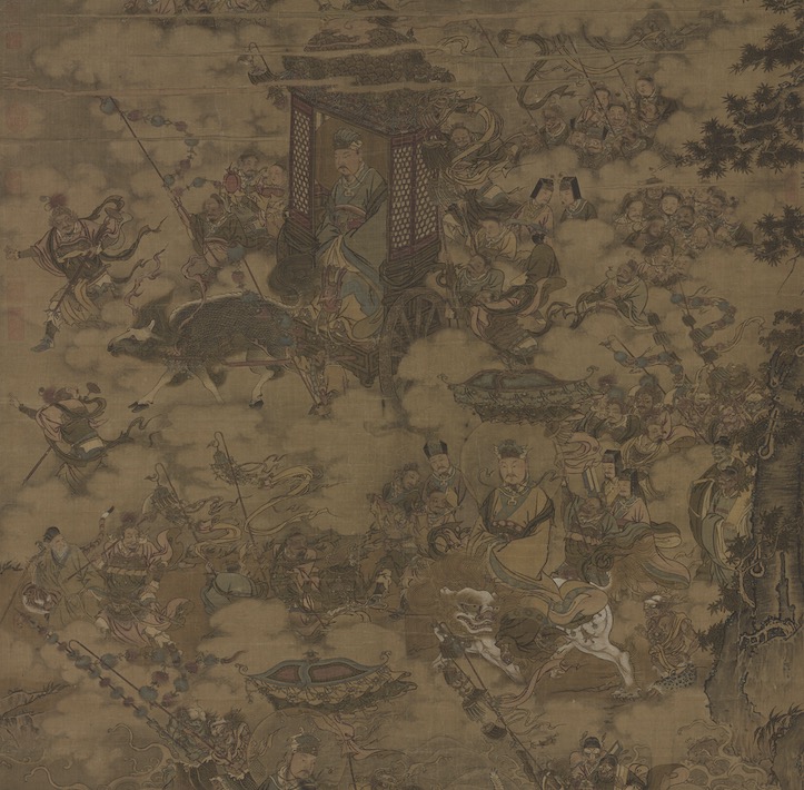 道教體系中,三官大帝為主掌天、地、水三界的神明,又分別主賜福、赦罪和解厄,神格僅次於玉皇大帝。上元、中元、下元節,三官出巡考校三千世界功過,上至諸天神仙,下至君王賢臣,皆受其檢校。此圖描繪三官出巡盛況,畫面由上而下分別為天官、地官、水官的隊伍,三官服飾、隨行職官俱按道教經典。眾神各司其職,隊伍前方有僚佐、土地公領路,後有考官、考吏捧印、捧簿錄,水官身後亦有相貌奇特的水族隨行。本圖舊題為馬麟(活動於1195-1264)作,唯依畫風應屬元明所作。