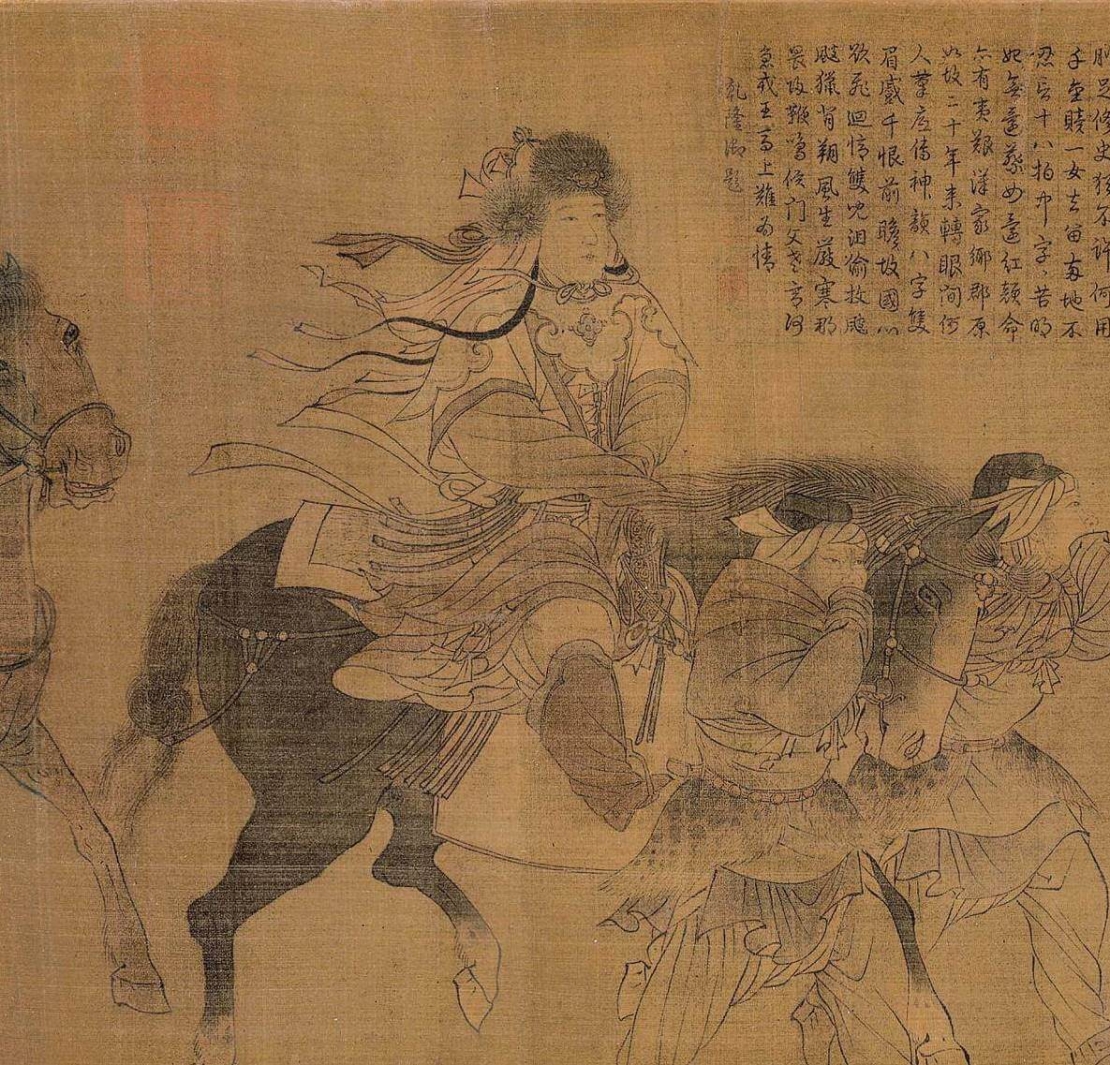 〈文姬歸漢圖〉雖描繪東漢故實,但畫中髮式衣著卻借自遼金,如文姬身穿一件打了很多結的內裡,應是金元時期流行的「裹肚」, 在黑龍江阿城金墓和內蒙古達茂旗明水墓有出土(註2)。隊伍倒數第二位隨從,身背龜殼似的容器,實為盛酒的背壺,在內蒙古科右中旗代欽塔拉遼代墓群有出土類似物;而畫中匈奴人的雙辮,也像契丹髡髮(註3)。