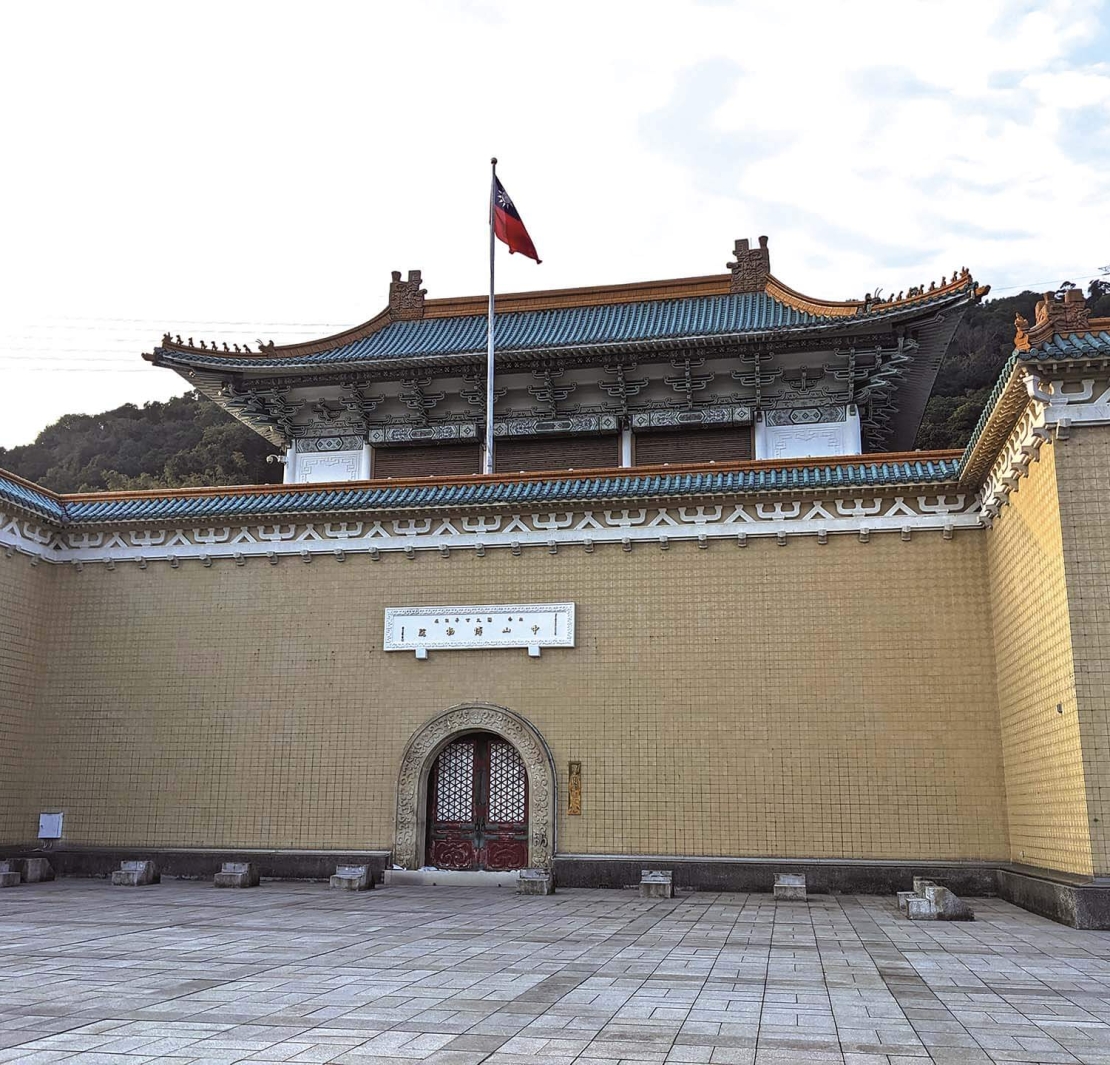 故宮二樓戶外平臺,可見「中山博物院」匾額及紅色拱門。攝影/江采蘋。